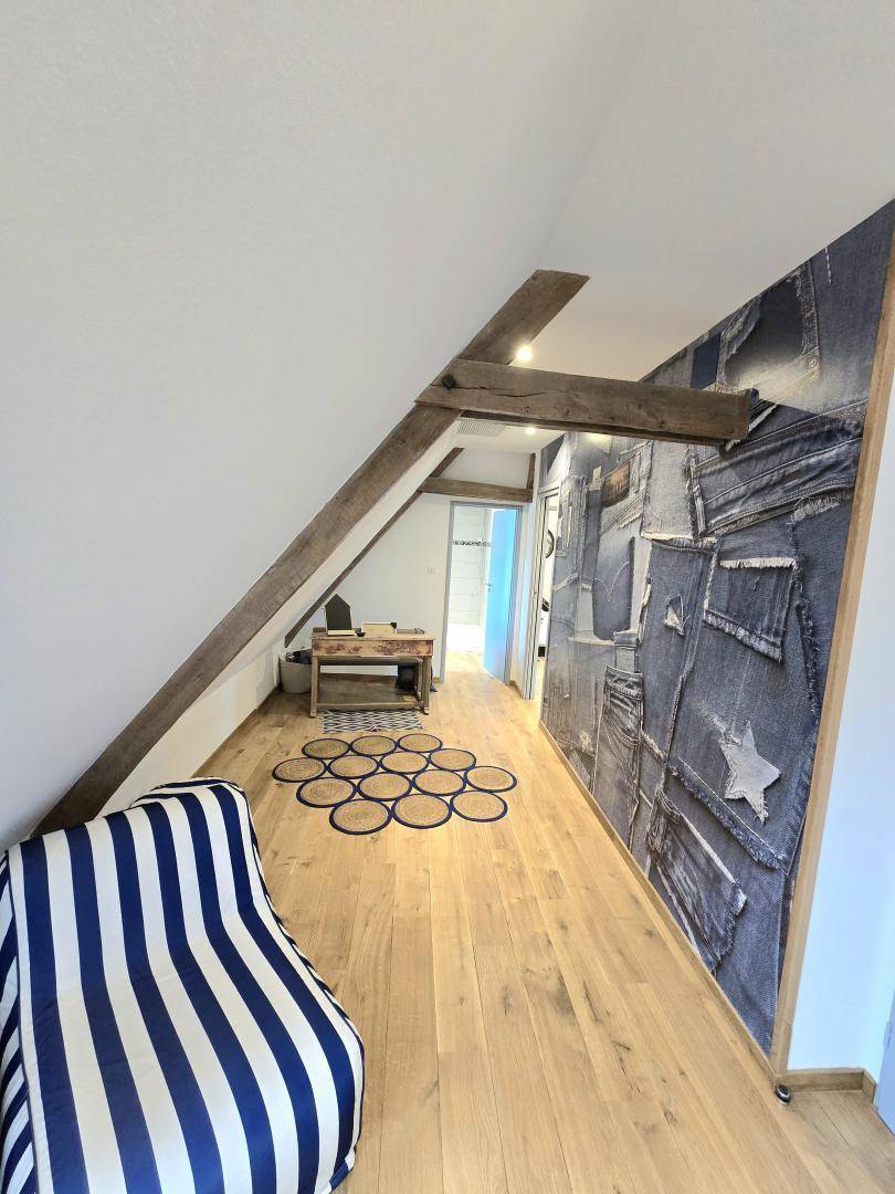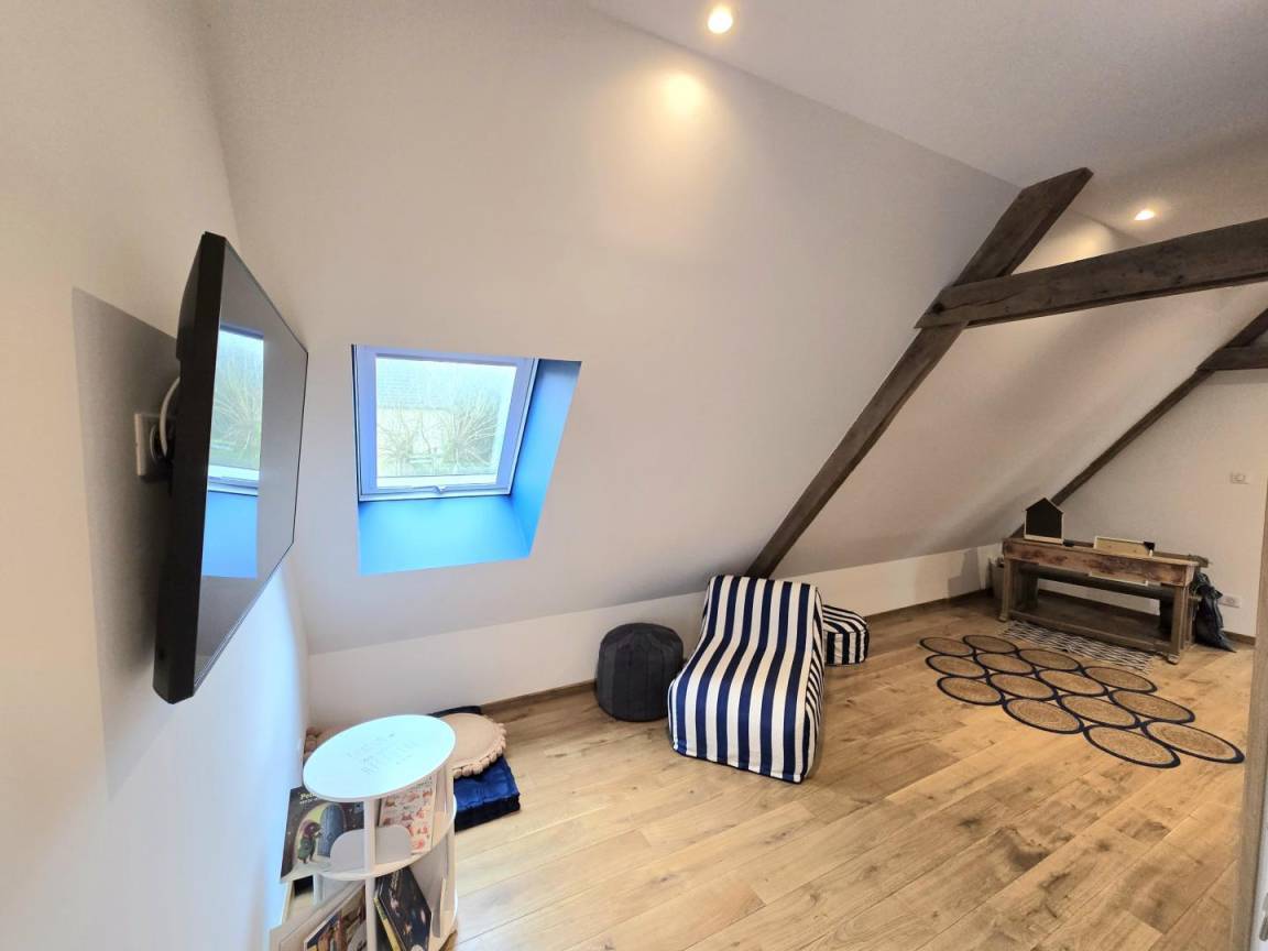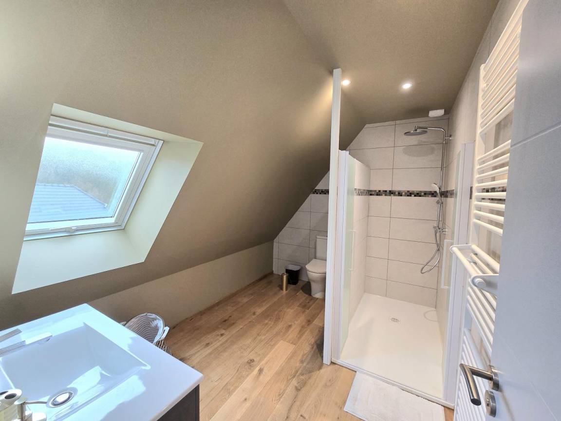 Im Obergeschoss: zwei Schlafzimmer mit einem 160x200-Bett. Zwei Badezimmer mit WC. Ein Schlafzimmer mit 2 80x200-Betten, die zu einem 160-Bett zusammengeschoben werden können.