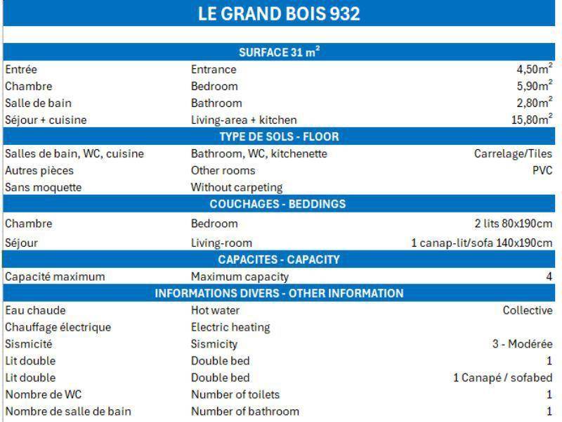 Die Residenz Grand Bois befindet sich in idealer Lage im freundlichen und charmanten Ferienort La Tania im Herzen der 3 Täler. Die Residenz liegt in der Nähe des Zentrums des Ferienorts, wo Sie Geschäfte, das Kino, die Bäckerei, einen Minimarkt, Bars und Restaurants finden. Die Residenz besteht aus 9 Etagen mit Aufzug. Fläche von ungefähr 31 m². 9te Etage. Orientierung : Ost. Wohnzimmer mit Klappschlafcouch (140x190). Schlafzimmer mit 2 Einzelbetten (80x190). Kochnische mit Kaffeemaschine (filtre), kleiner Backofen mit Mikrowellenfunktion, Dunstabzugshaube, Geschirrspülmaschine, 2 Glaskeramikkochfelder, Kühlschrank. Badezimmer mit Badewanne. separates WC. Balkon.