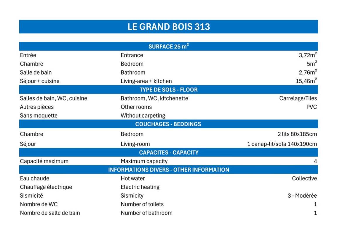 Es liegt 50 Meter von den Skiliften und 150 Meter vom Zentrum und den Geschäften entfernt. Fläche von ungefähr 25 m². 6te Etage. Orientierung : West. Wohnzimmer mit Klappschlafcouch (140x190). Schlafzimmer mit Einzelbett (80x190). Kochnische mit Kaffeemaschine (filtre), kleiner Backofen mit Mikrowellenfunktion, Geschirrspülmaschine, 4 Glaskeramikkochfelder, Kühlschrank. Badezimmer mit Dusche, WC. Balkon.