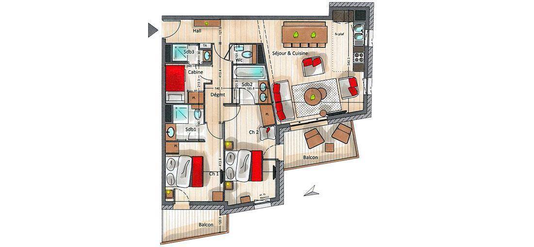 Fläche von ungefähr 79 m². 1te Etage. Orientierung : Süd, West. Blick berg. Wohnzimmer. offener Schlafbereich mit 2 Stockbetten, . Schlafzimmer mit Doppelbett, , Haartrockner, Handtuchtrockner. Schlafzimmer mit Doppelbett, , Haartrockner, Handtuchtrockner, WC. offene Küche mit Wasserkocher, Kaffeemaschine (Nespresso), Backofen, Toaster, Dunstabzugshaube, Waschmaschine, Geschirrspülmaschine, 2 Herdplatten, , Kühlschrank. separates WC. Balkon. Die oberen Betten sind nicht für Kinder unter 6 Jahren geeignet.