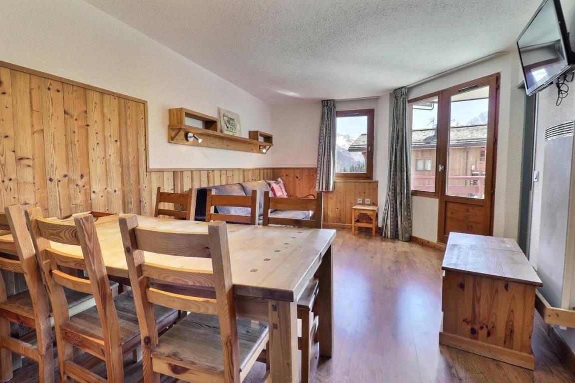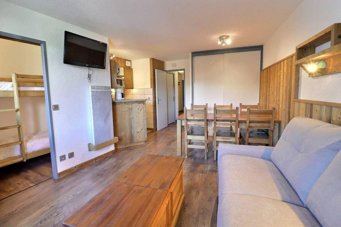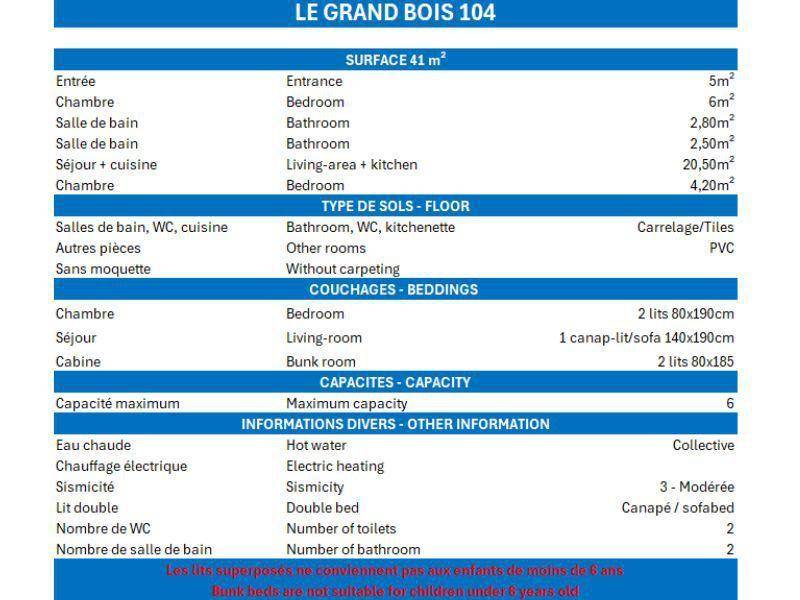 Die Residenz Grand Bois befindet sich in idealer Lage im freundlichen und charmanten Ferienort La Tania im Herzen der 3 Täler. Die Residenz liegt in der Nähe des Zentrums des Ferienorts, wo Sie Geschäfte, das Kino, die Bäckerei, einen Minimarkt, Bars und Restaurants finden. Die Residenz besteht aus 9 Etagen mit Aufzug. Fläche von ungefähr 41 m². 1te Etage. Orientierung : Ost. Wohnzimmer mit Klappschlafcouch. Schlafzimmer mit 2 Einzelbetten (90x190). offener Schlafbereich mit 2 Stockbetten (80x185). Kochnische mit Kaffeemaschine, kleiner Backofen mit Mikrowellenfunktion, Dunstabzugshaube, Geschirrspülmaschine, Glaskeramikkochfelder, Kühlschrank. separates WC. Badezimmer mit Badewanne. Waschräume mit Dusche, WC. Balkon. Die oberen Betten sind nicht für Kinder unter 6 Jahren geeignet.