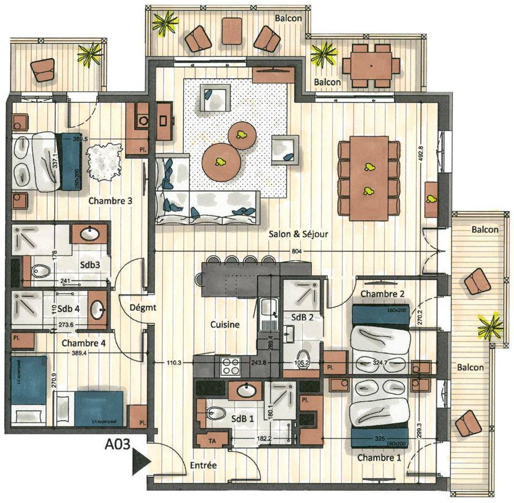 Fläche von ungefähr 123 m². 5te Etage. Orientierung : Süd, West. Blick skipisten ODER Blick panorama ODER Blick berg. Wohnzimmer mit Kamin. 2 Schlafzimmer mit , Doppelbett, , Haartrockner, Handtuchtrockner, WC. Schlafzimmer mit Balkon, Doppelbett, , Haartrockner, Handtuchtrockner, WC. Küche mit Wasserkocher, Kaffeemaschine, Backofen, Toaster, Dunstabzugshaube, Waschmaschine, Geschirrspülmaschine, 2 Herdplatten, , Kühlschrank. Balkon. mit 4 Stockbetten, , Haartrockner, Handtuchtrockner. Die oberen Betten sind nicht für Kinder unter 6 Jahren geeignet.