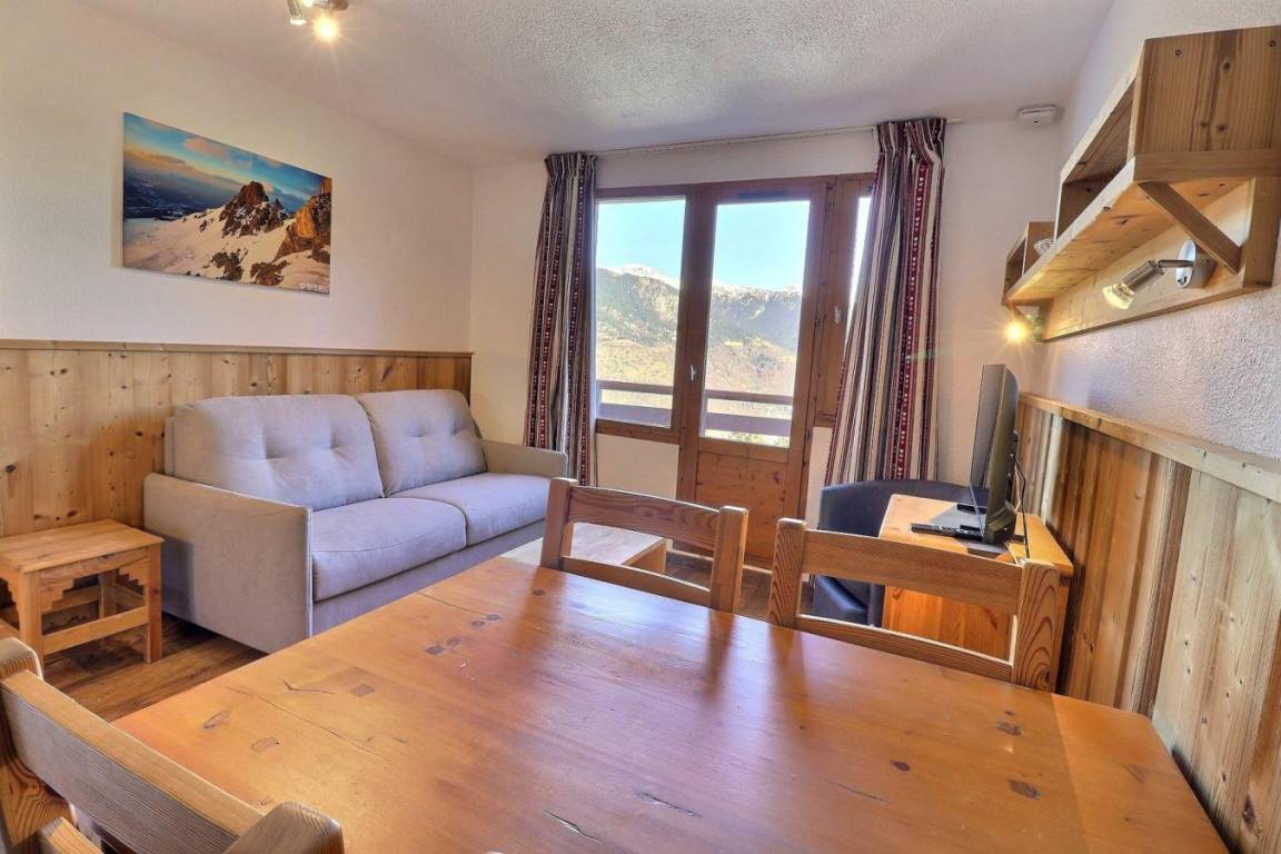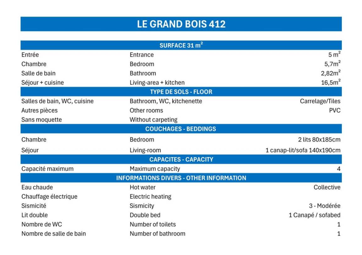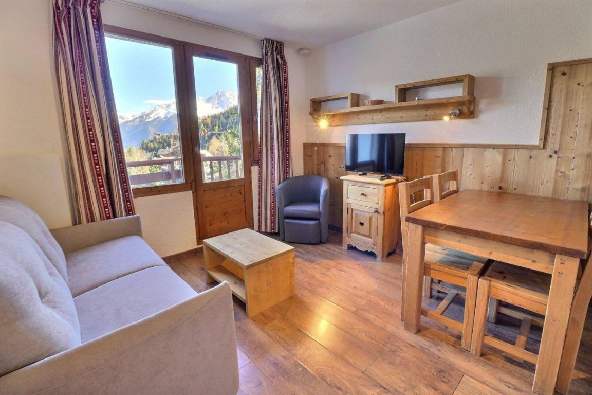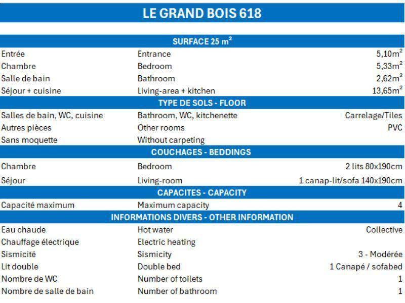 Die Residenz Grand Bois befindet sich in idealer Lage im freundlichen und charmanten Ferienort La Tania im Herzen der 3 Täler. Die Residenz liegt in der Nähe des Zentrums des Ferienorts, wo Sie Geschäfte, das Kino, die Bäckerei, einen Minimarkt, Bars und Restaurants finden. Die Residenz besteht aus 9 Etagen mit Aufzug. Fläche von ungefähr 25 m². 9te Etage. Orientierung : Ost. Wohnzimmer mit Klappschlafcouch (140x190). Schlafzimmer mit 2 Einzelbetten (80x190). Kochnische mit Kaffeemaschine (filtre), kleiner Backofen mit Mikrowellenfunktion, Dunstabzugshaube, Geschirrspülmaschine, 4 Glaskeramikkochfelder, Kühlschrank. Badezimmer mit Badewanne. separates WC. Balkon.