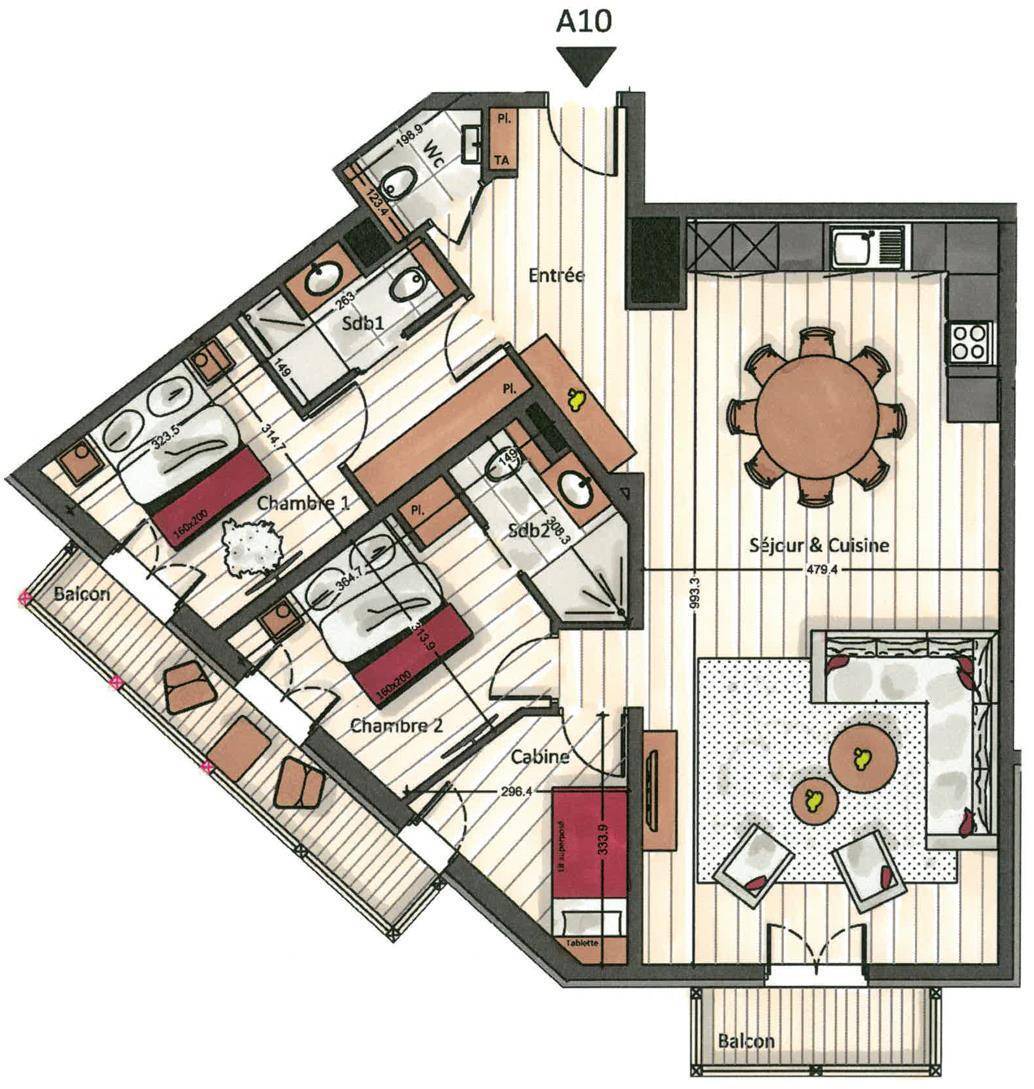 Fläche von ungefähr 98 m². 4te Etage. Orientierung : Nord. Blick berg. Wohnzimmer. 2 Schlafzimmer mit Doppelbett, , Haartrockner, Handtuchtrockner, WC. offener Schlafbereich mit 2 Stockbetten. Küche mit Wasserkocher, Kaffeemaschine (nespres), Backofen, Toaster, Dunstabzugshaube, Waschmaschine, Geschirrspülmaschine, 2 Herdplatten, , Kühlschrank. separates WC. Balkon. Die oberen Betten sind nicht für Kinder unter 6 Jahren geeignet.