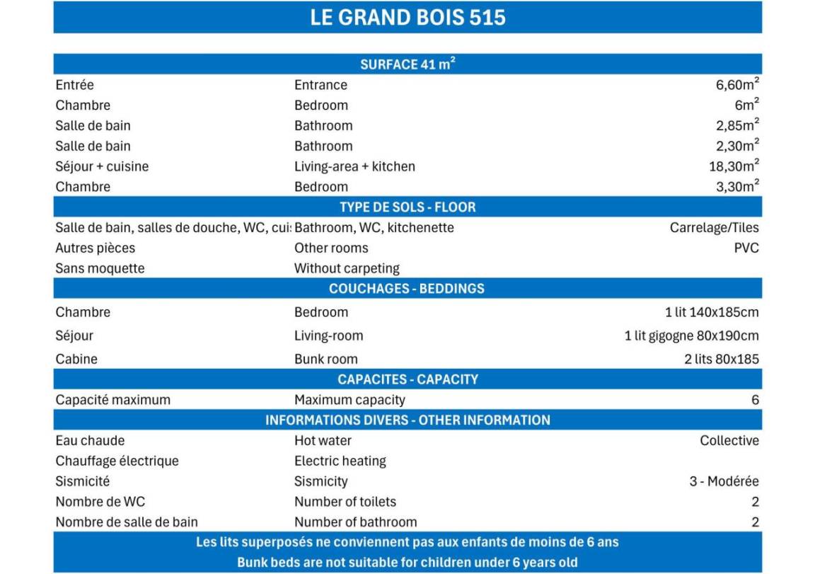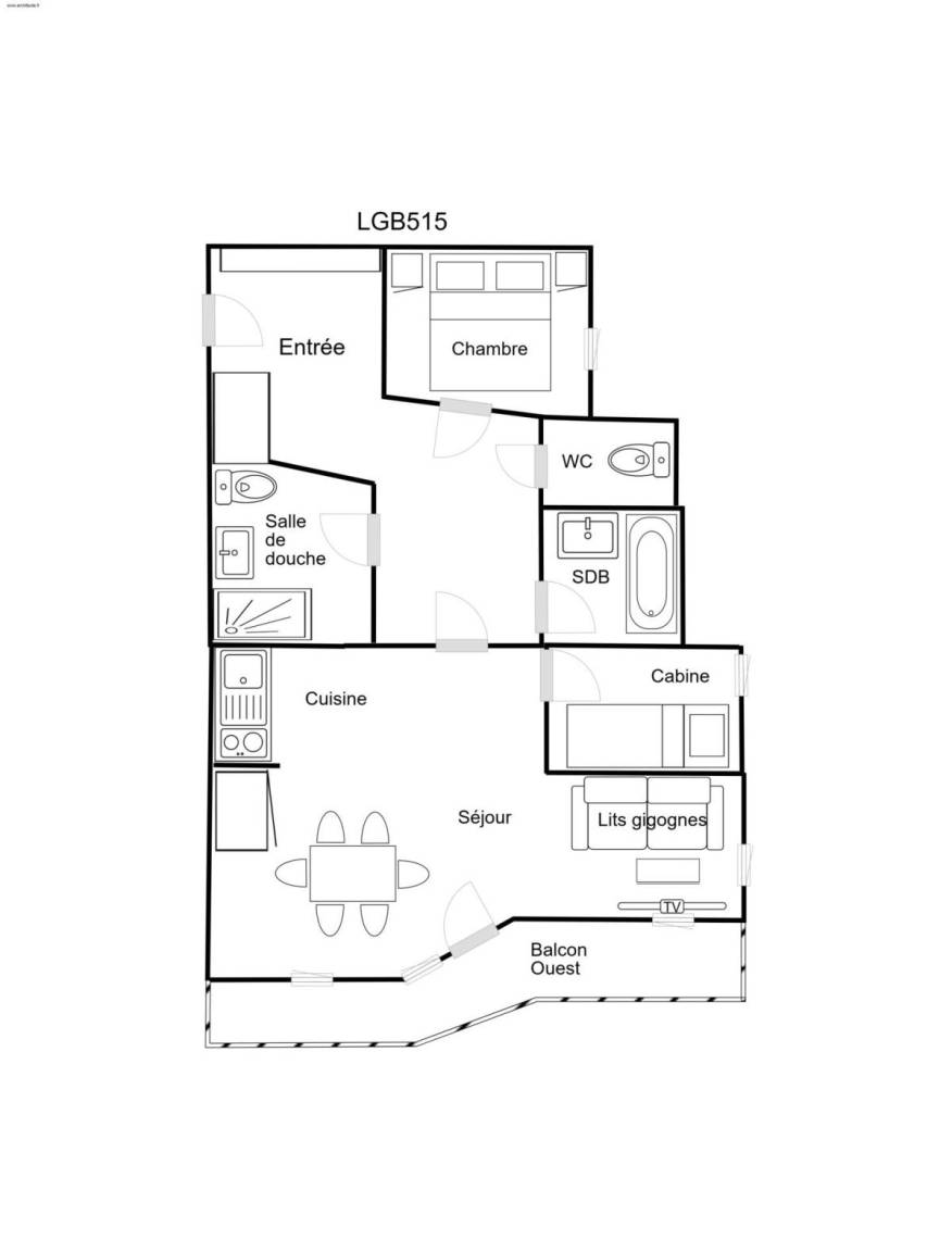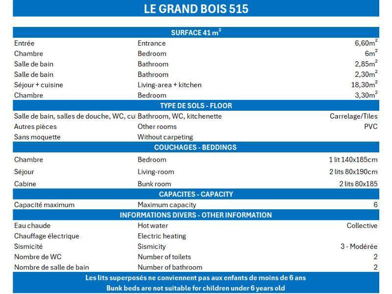 Es liegt 50 Meter von den Skiliften und 150 Meter vom Zentrum und den Geschäften entfernt. Fläche von ungefähr 41 m². 5te Etage. Orientierung : West. Wohnzimmer mit Ausziehschlafcouch für 2 Personen (80*190). Schlafzimmer mit Doppelbett (140*185). offener Schlafbereich mit 2 Stockbetten (80*185). Kochnische mit Kaffeemaschine (filtre), kleiner Backofen mit Mikrowellenfunktion, Dunstabzugshaube, Geschirrspülmaschine, 2 Glaskeramikkochfelder, Kühlschrank. Badezimmer mit Badewanne. Waschräume mit Dusche, WC. separates WC. Balkon. Die oberen Betten sind nicht für Kinder unter 6 Jahren geeignet.