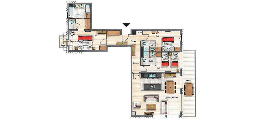 Fläche von ungefähr 124 m². 4te Etage. Orientierung : Süd, West. Blick berg. Wohnzimmer mit Kamin. Schlafzimmer mit Doppelbett, , WC (séparé). Schlafzimmer mit Doppelbett, , WC. Schlafzimmer mit 2 Stockbetten, , WC. Küche mit Wasserkocher, Kaffeemaschine (Nespresso), Backofen, Toaster, Dunstabzugshaube, Waschmaschine, Geschirrspülmaschine, 2 Herdplatten, , Kühlschrank. Balkon. Die oberen Betten sind nicht für Kinder unter 6 Jahren geeignet.