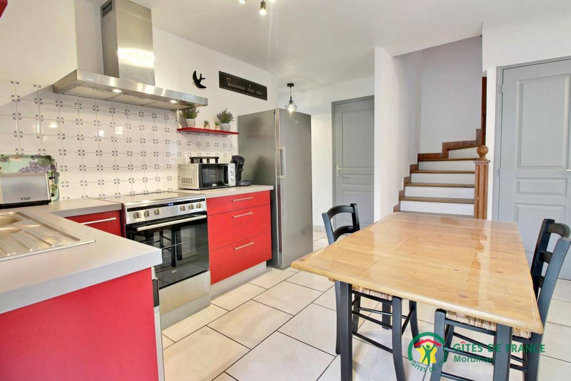 - Im Erdgeschoss: ein schönes Wohnzimmer, schön eingerichtet mit Einbauküche, Wohnzimmer und Lounge, die auf die Terrasse führen. Auch auf dieser Ebene: 1 Schlafzimmer (1 Bett 160), ein Duschbad und eine separate Toilette mit Waschbecken.