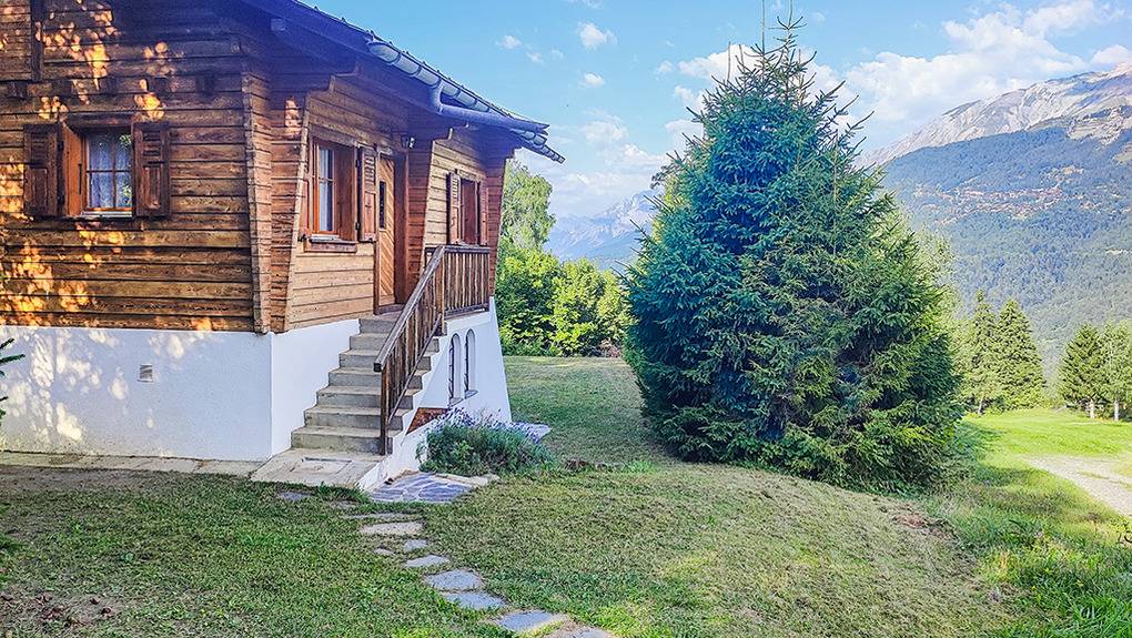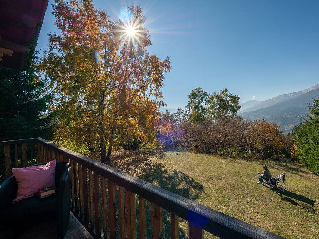 Haus: Schönes Walliser Chalet auf einem großzügigen Gartengrundstück. 4-Zimmer-Haus mit 90 qm Wohnfläche über 2 Etagen. Rustikal-gemütliche Einrichtung. Typisches Chalet-Flair mit schönen Holzbalkendecken, Steinplattenboden im Wohnraum. Internetzugang über W-Lan (max. 4G). Waschmaschine, Trockner. Heizung über E-Radiatoren, Kaminofen. Terrasse mit Sitzmöbeln, Sonnenliegen. Balkon mit Panoramablick in Rhônetal bis Martigny. Schöner Garten mit Grillkamin, eigenem Brunnen, großer Rasenfläche und angrenzenden, Blickschutz bietenden Bäumen. 2 Pkw-Stellplätze am Haus.