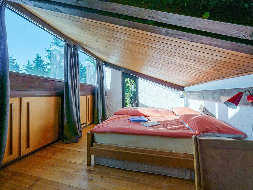 Dachgeschoss mit Schrägen: Hübsche Galerie, offen zum Wohnraum mit Sofa-Sitzecke, Smart-TV, Schreibtisch. Schönes Doppelzimmer. 2 zusätzliche Schlafplätze vorhanden (Doppelluftmatratze auf der Galerie oder im Doppelzimmer).