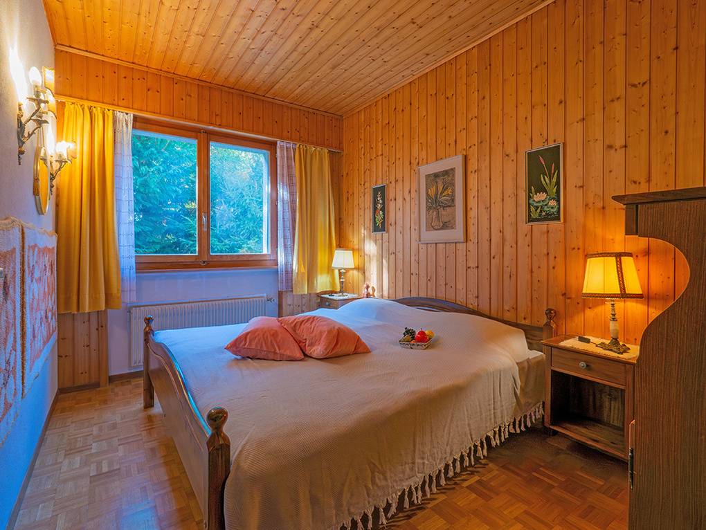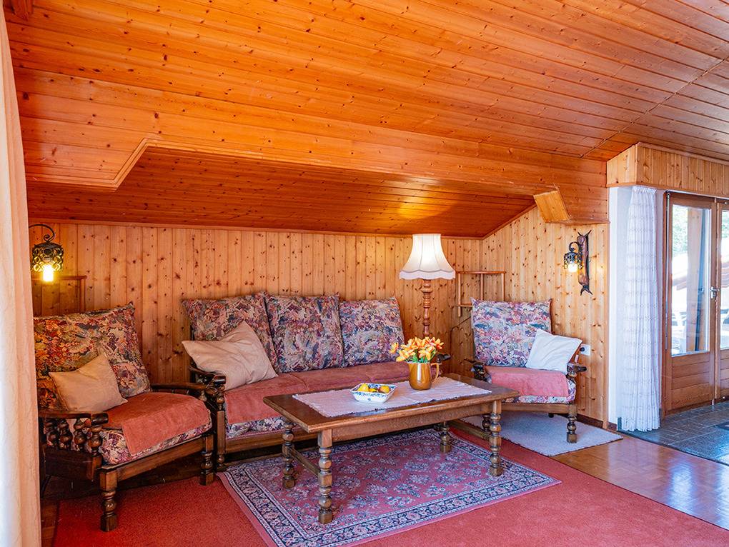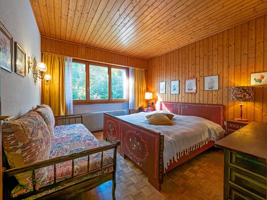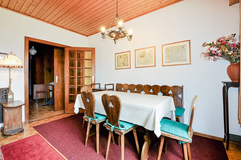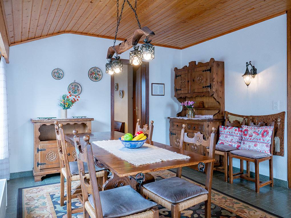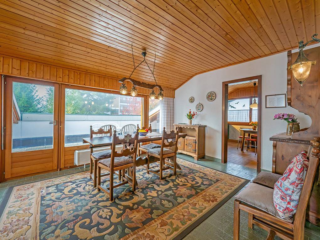 Haus: Großes regionaltypisches Chalet mit Schwimmbad und Sauna. Schönes Wohnhaus mit 2 Ferienwohnungen und der fest bewohnten Wohnung des Vermieters. Bei gemeinsamer Anmietung beider Fewos ergeben sich 6 Zimmer mit 180 qm Wohnfläche, gemeinsames Essen in der oberen Wohnung möglich. Gemütliche Chalet-Atmosphäre durch Holzvertäfelungen in vielen Räumen. Im Haus: großes Schwimmbad (10 x 4,50 Meter, 24°C, kostenfrei nutzbar) mit Ruheliegen vor großen Panoramafenstern, Sauna (Gebühr), Duschen, WC. Internetzugang über W-Lan. Waschmaschine. Zentralheizung. Nichtraucherhaus. Balkon, Terrasse (Sitzmöbel). Tiefgarage mit 4 Pkw-Stellplätzen (max. 1,95 m Höhe), weitere Außenplätze je nach Verfügbarkeit. Hinweise: Betriebszeiten Schwimmbad nur Juli, August. Gemeinschaftsnutzung mit zwei weiteren Fewos im Nachbarchalet. Aufgrund der Bettengrößen ist eine Belegung mit max. 12 Erwachsenen möglich.