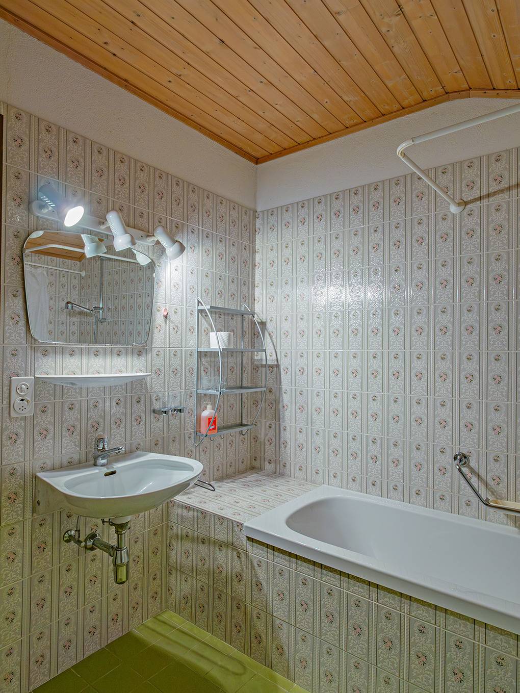 Parterre: Gemütlicher Wohn-/Schlafraum (25 qm) mit Sitzgruppe (2 Schlafsofas für je 1 Pers.), Kabel-TV, Esstisch. Küche mit Backofen, Spülmaschine. Flur mit Kleiderschränken. Doppelzimmer. 3-Bettzimmer mit 2 Einzelbetten, Zustellbett. Bad: Bw/Du, Wb, WC. Zusätzliche Dusche in der Schwimmhalle neben der Wohnung. Terrasse mit Sitzmöbeln, schönem Blick. Gemeinschaftsflur mit Treppenhaus in die