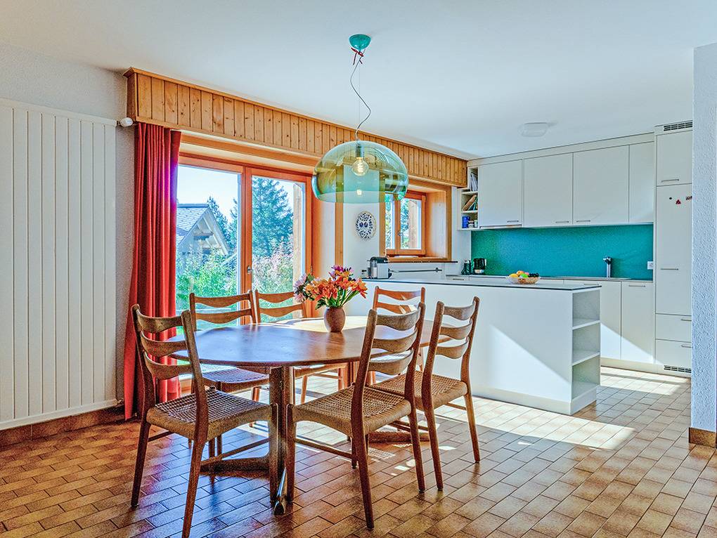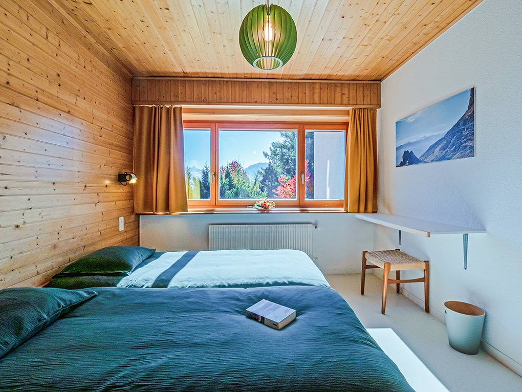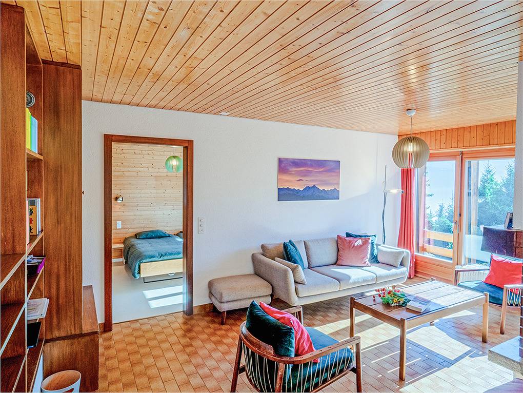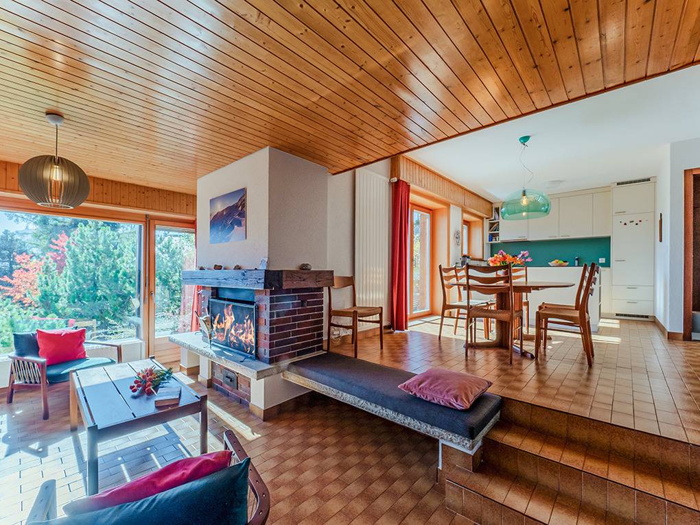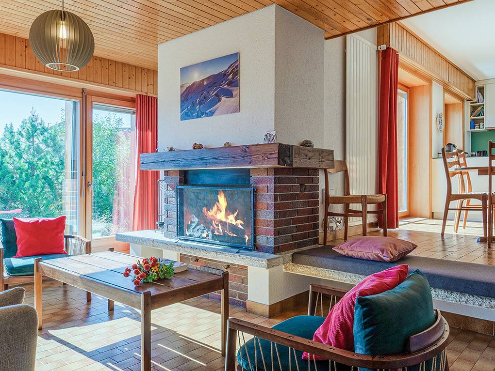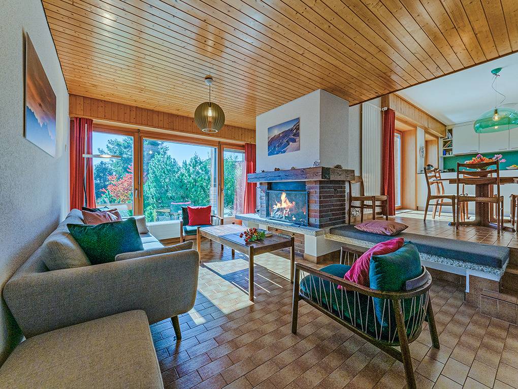 Ch 361.21 Wohnung 1-6 Pers.: 4-Zimmerwohnung mit 120 qm Wohnfläche, Parterre. Großzügiger Wohnraum (50 qm) über 2 Ebenen mit Panoramafenstern, Sitzgruppe am Kamin, Kabel-TV, Esstisch, moderner Einbauküche (Backofen, Spülmaschine), Terrasse. Großes Doppelzimmer. Doppelzimmer. Bad: Dusche, 2 Wb. 2-Bettzimmer mit Etagenbett. Separates WC, Wb.