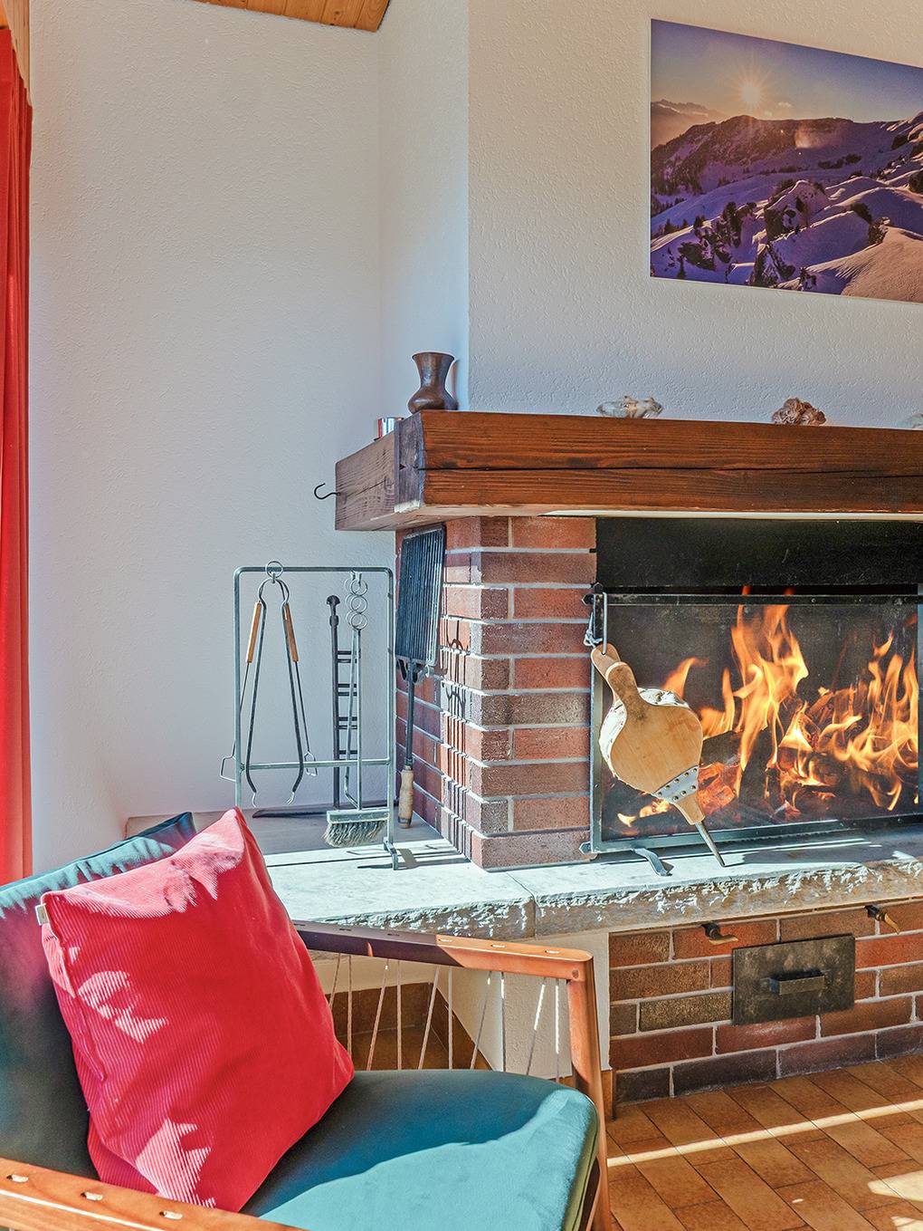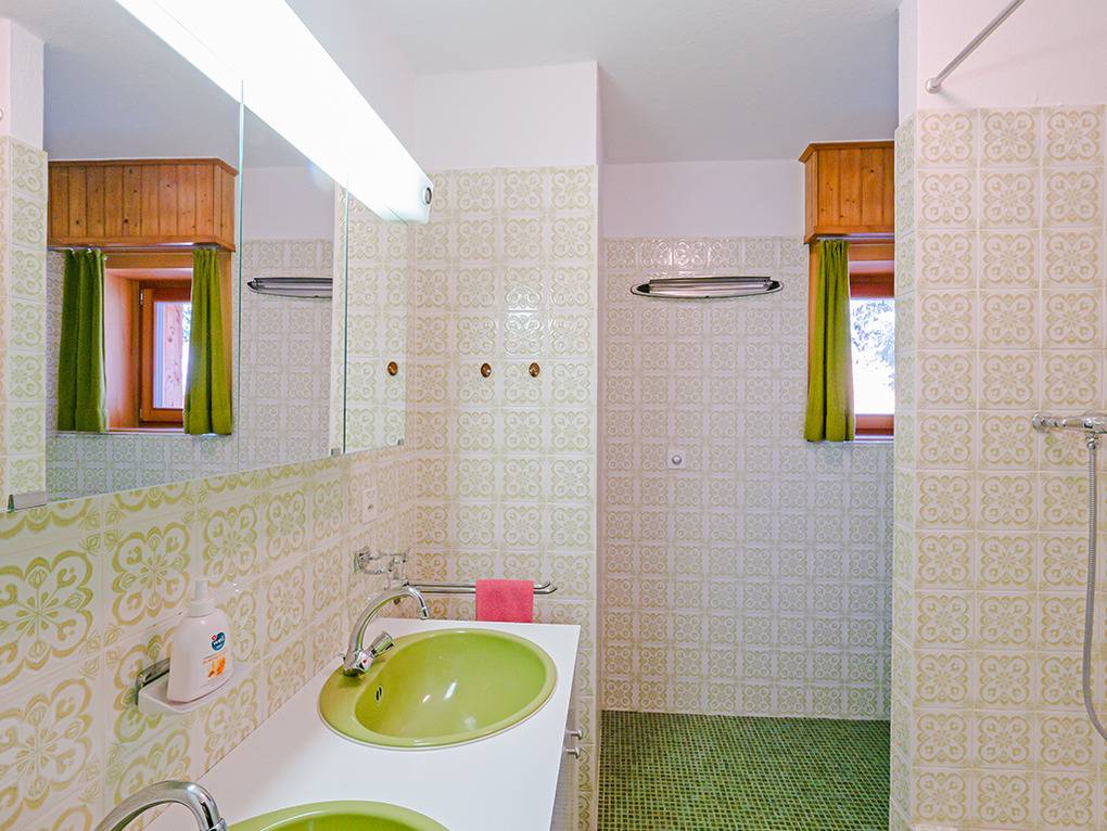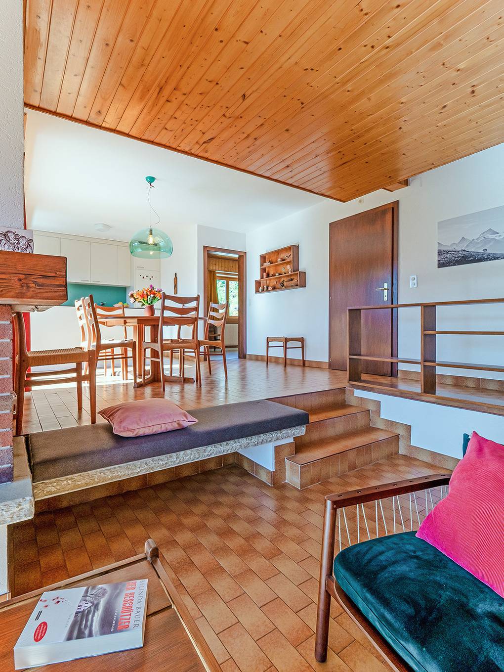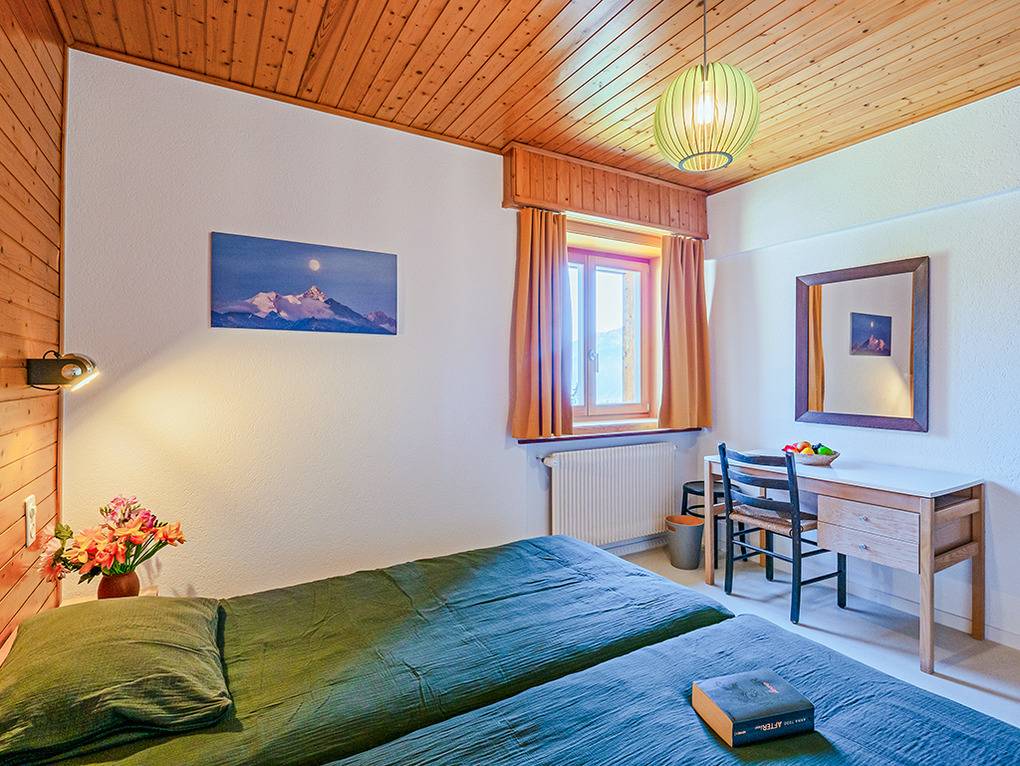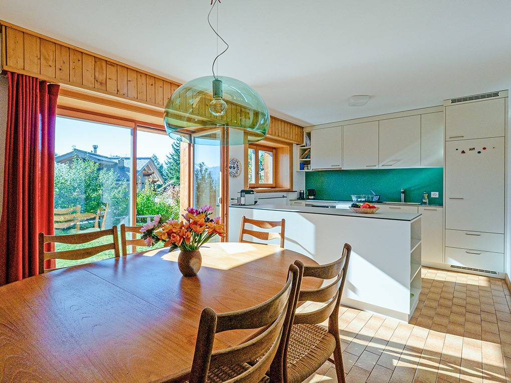 Ch 361.21 Wohnung 1-6 Pers.: 4-Zimmerwohnung mit 120 qm Wohnfläche, Parterre. Großzügiger Wohnraum (50 qm) über 2 Ebenen mit Panoramafenstern, Sitzgruppe am Kamin, Kabel-TV, Esstisch, moderner Einbauküche (Backofen, Spülmaschine), Terrasse. Großes Doppelzimmer. Doppelzimmer. Bad: Dusche, 2 Wb. 2-Bettzimmer mit Etagenbett. Separates WC, Wb.