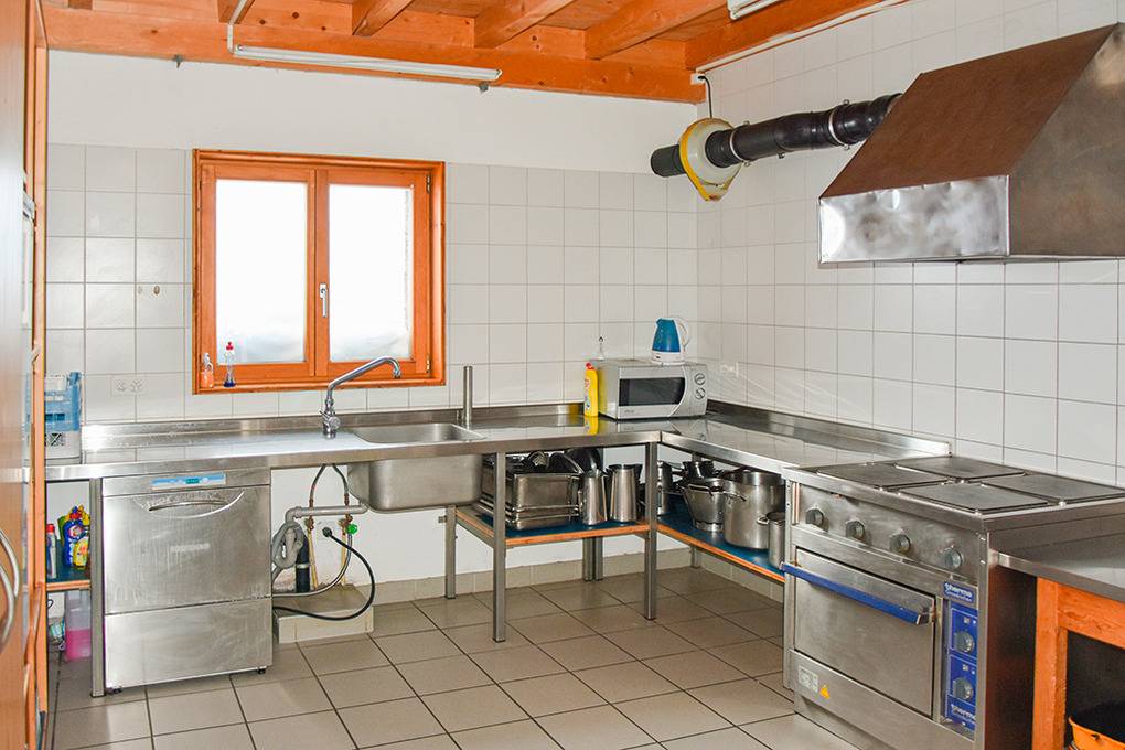 Parterre: Kleiner Vorraum mit Skischuhregalen. Großer, schöner Tagesraum mit rustikalem Flair durch Holzvertäfelungen. Offener Durchgang in die Gruppenküche mit Tiefkühltruhe. Bad: 2 Du, 2 sep. WC. Waschrinne (4 Hähne) in Flurnische. Separates WC.