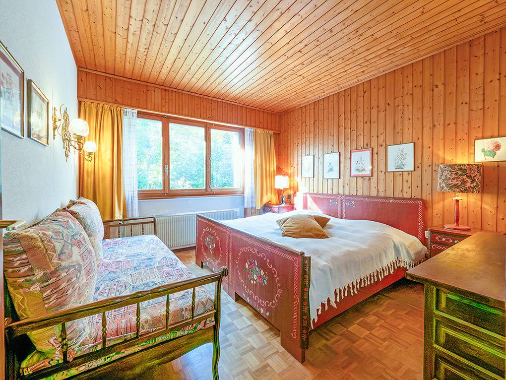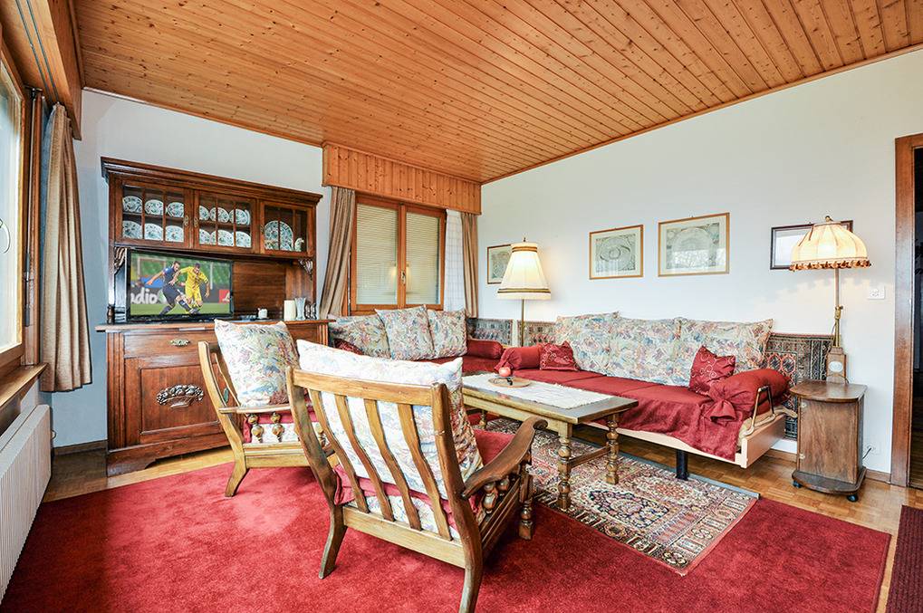 Haus: Großes regionaltypisches Chalet mit Schwimmbad und Sauna. . Schönes Wohnhaus mit 2 Ferienwohnungen und der fest bewohnten Wohnung des Vermieters. Gemütliche Chalet-Atmosphäre durch Holzvertäfelungen in vielen Räumen. Im Haus: großes Schwimmbad (10 x 4,50 Meter, 24°C, kostenfrei nutzbar) mit Ruheliegen vor großen Panoramafenstern, Sauna (Gebühr), Duschen, WC. Buchbar sind die untere Etage des Hauses (CH 361.018) und eine separate Wohnung im ersten Stock (CH 361.019). Das gesamte Haus für bis zu 14 Personen kann auch unter der Nummer CH 361.020 gebucht werden (separate Anzeige).