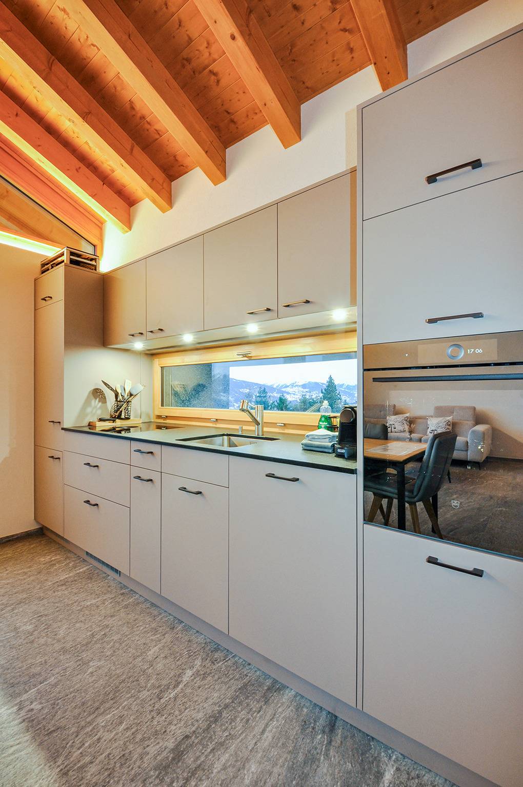 1. Etage (Hanglage): Eingang, Garderobe. Sehr schöner, großzügig bis in den Dachgiebel ausgebauter Wohnraum (38 qm) mit großer Panoramafensterfront, gemütlicher Sitzgruppe am Kaminofen, Esstisch, Einbauküche (Backofen, Mikrowelle, Spülmaschine), Terrasse. Separates WC.