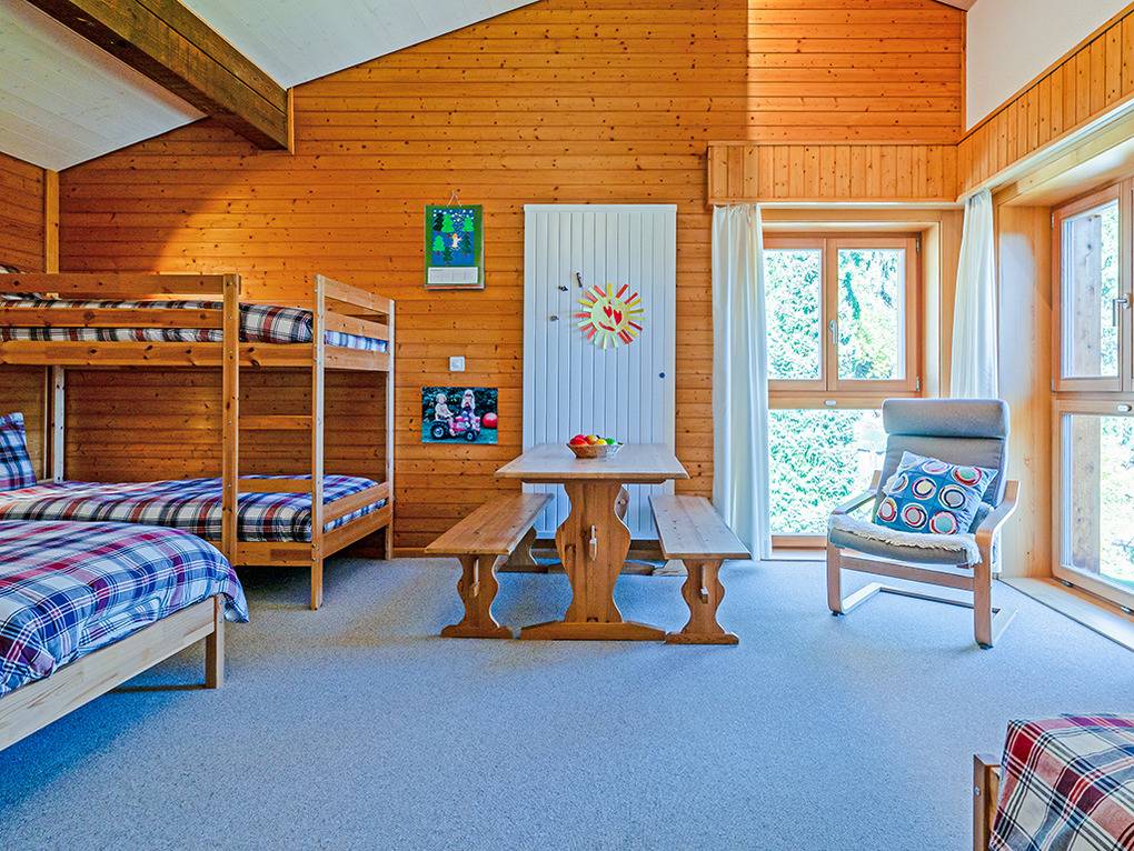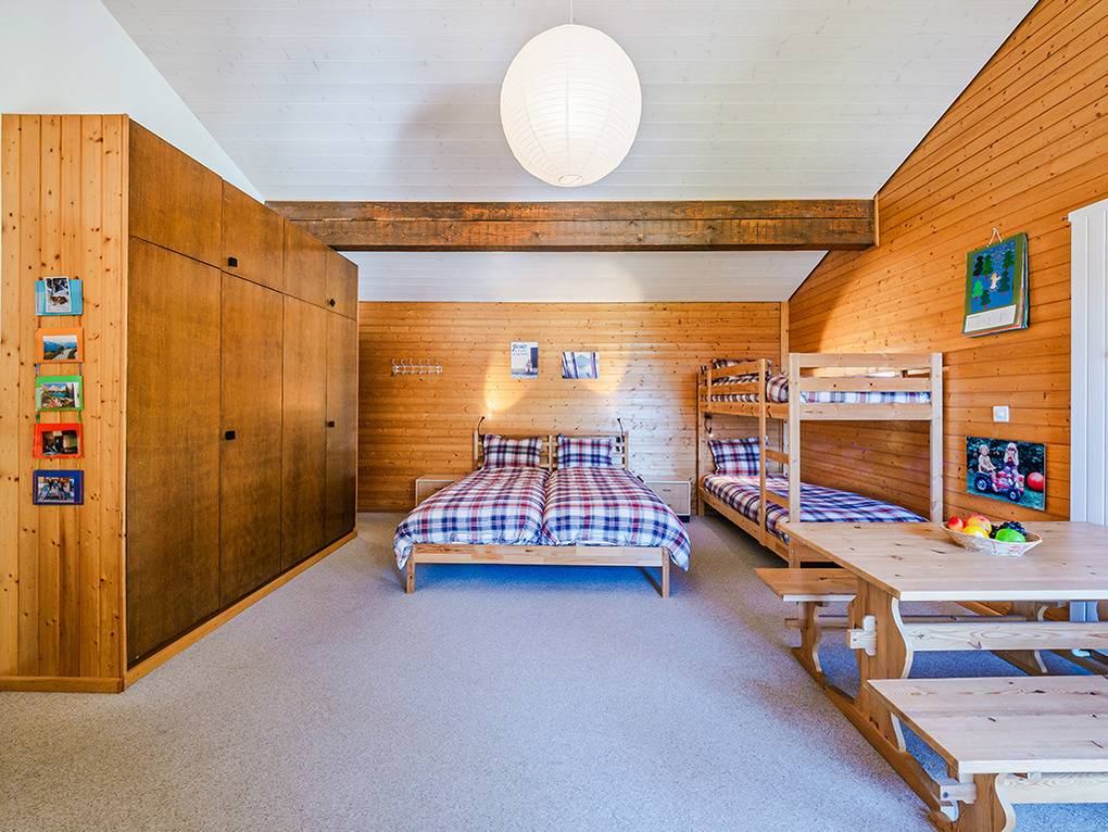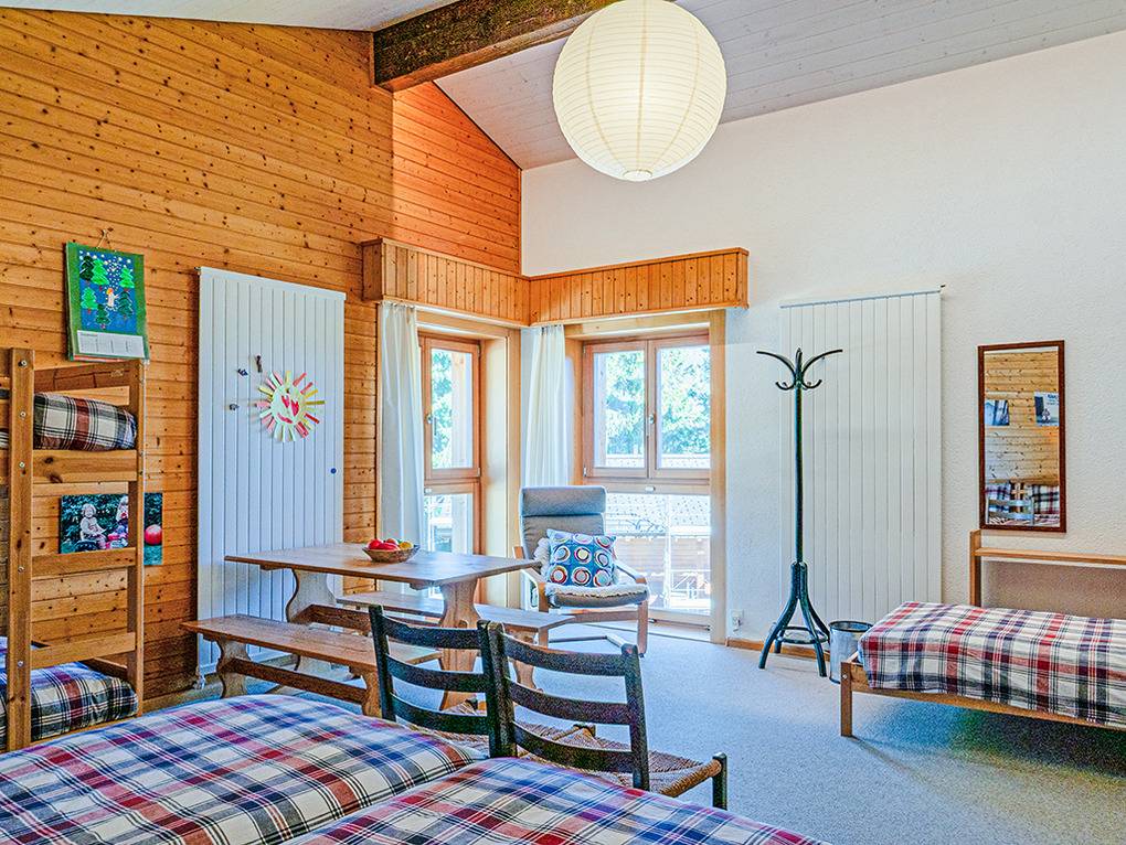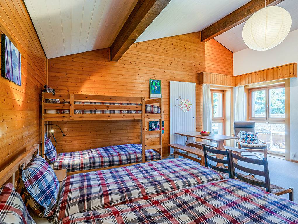 Ch 361.22 Wohnung 4-11 Pers.: 5-Zimmerwohnung mit 150 qm Wohnfläche über 2 Etagen. Parterre: Großzügiger Wohnraum (50 qm) über 2 Ebenen mit Panoramafenstern, Sitzgruppe am Kamin, Kabel-TV, Esstisch, moderner Einbauküche (Backofen, Spülmaschine), Terrasse. Großes Doppelzimmer. Doppelzimmer. Bad: Dusche, 2 Waschbecken. 2-Bettzimmer mit Etagenbett. Separates WC, Wb. 1. Etage (Zugang über Gemeinschaftsflur): Großes 5-Bettzimmer, ausgebaut bis zum Dachboden mit sehr schönem Blick, Einzelbett, Doppelbett, Etagenbett, eigenem Bad (Dusche, Wb, WC).