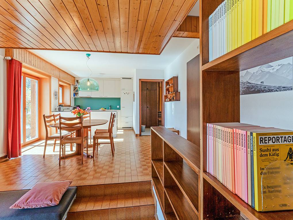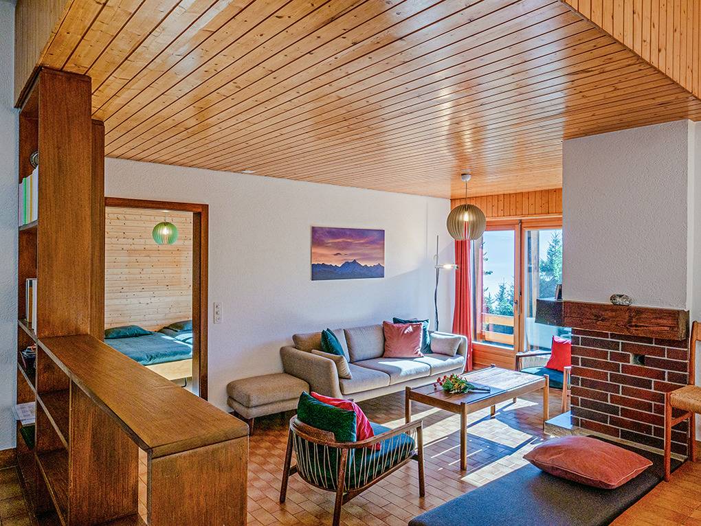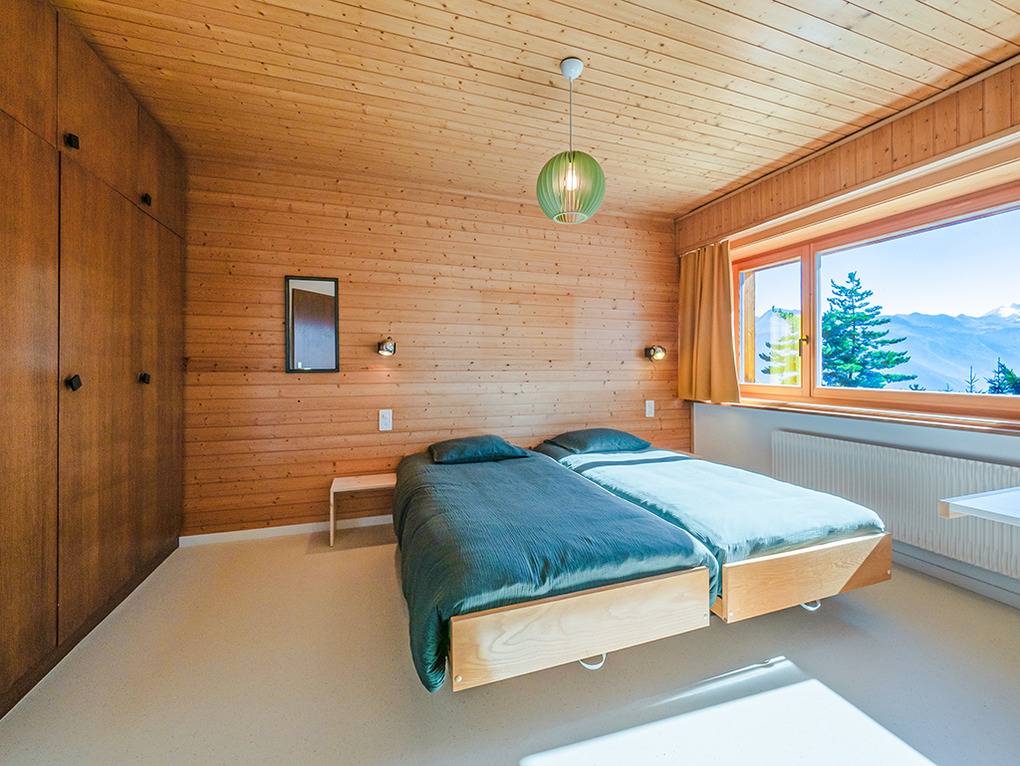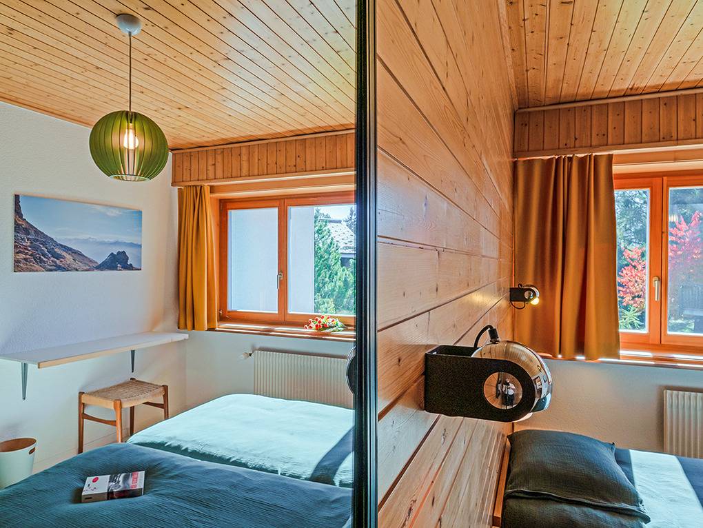 Ch 361.22 Wohnung 4-11 Pers.: 5-Zimmerwohnung mit 150 qm Wohnfläche über 2 Etagen. Parterre: Großzügiger Wohnraum (50 qm) über 2 Ebenen mit Panoramafenstern, Sitzgruppe am Kamin, Kabel-TV, Esstisch, moderner Einbauküche (Backofen, Spülmaschine), Terrasse. Großes Doppelzimmer. Doppelzimmer. Bad: Dusche, 2 Waschbecken. 2-Bettzimmer mit Etagenbett. Separates WC, Wb. 1. Etage (Zugang über Gemeinschaftsflur): Großes 5-Bettzimmer, ausgebaut bis zum Dachboden mit sehr schönem Blick, Einzelbett, Doppelbett, Etagenbett, eigenem Bad (Dusche, Wb, WC).