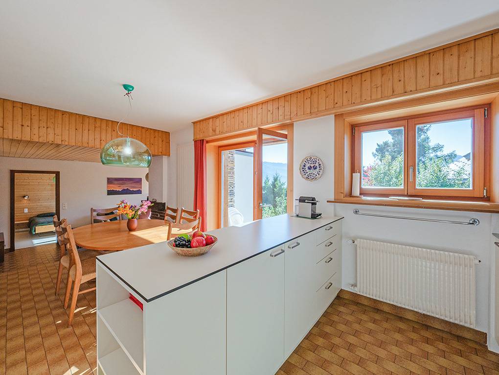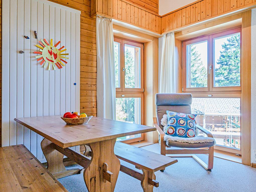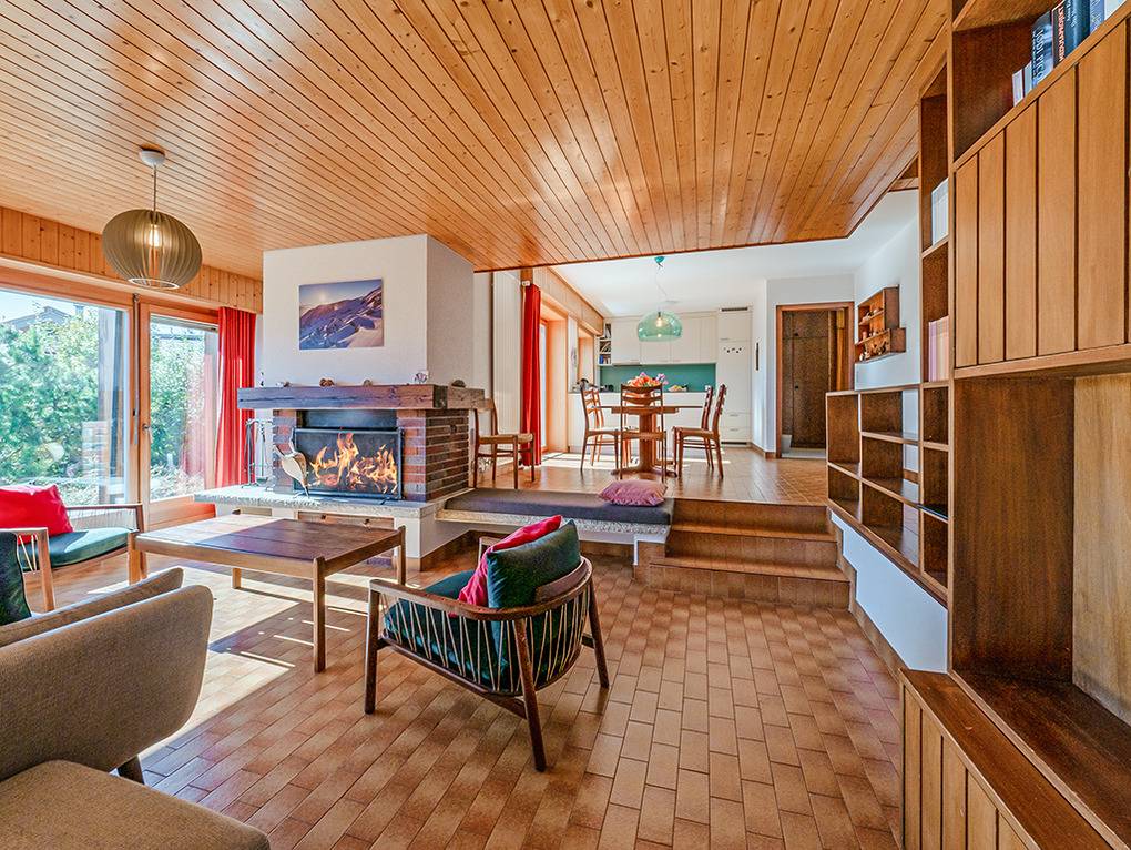 Haus: Sehr gepflegte Chaletwohnung mit Kamin. Regionaltypisches Ferienhaus mit zwei schönen Ferienwohnungen. Gemütliche, familiäre Chalet-Atmosphäre mit Holzvertäfelung in vielen Räumen. Offen gestaltete, sehr großzügige Architektur. Moderne Komfort-Ausstattung. Internetzugang kostenlos über W-Lan. Pellet-Zentralheizung. Nichtraucherhaus. Terrasse mit Sitzmöbeln. Kleiner Garten mit Sonnenliegen. Garage für einen kleinen Pkw. 2 weitere Pkw-Stellplätze am Haus.