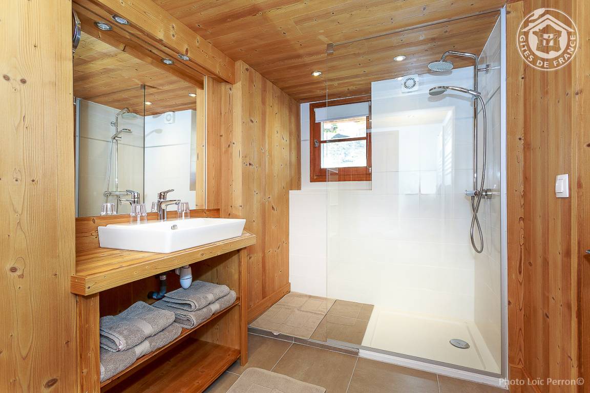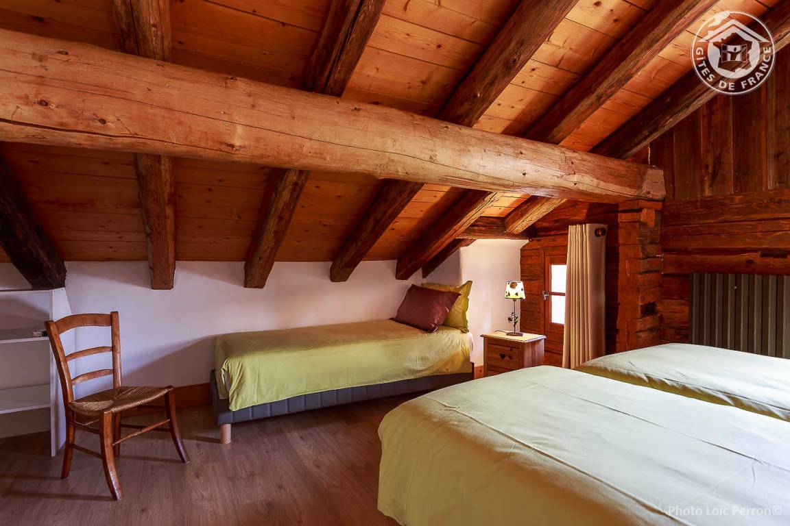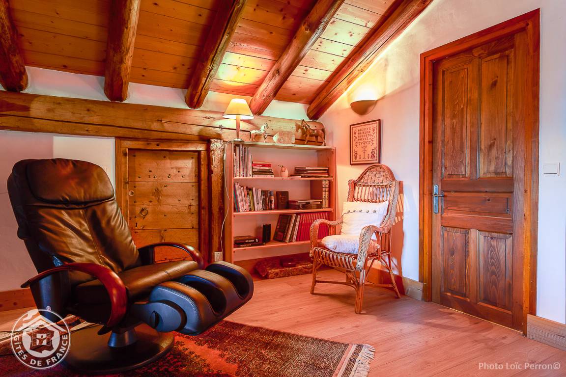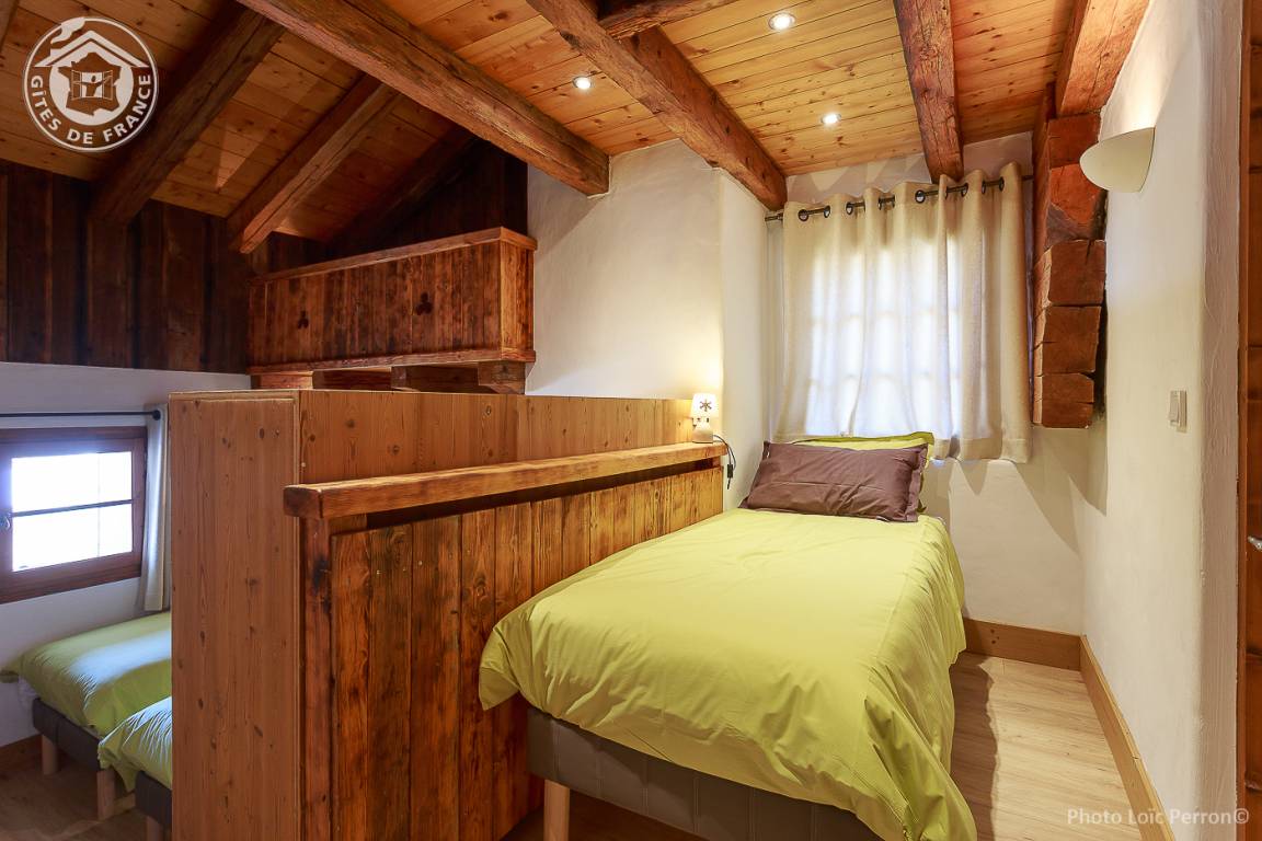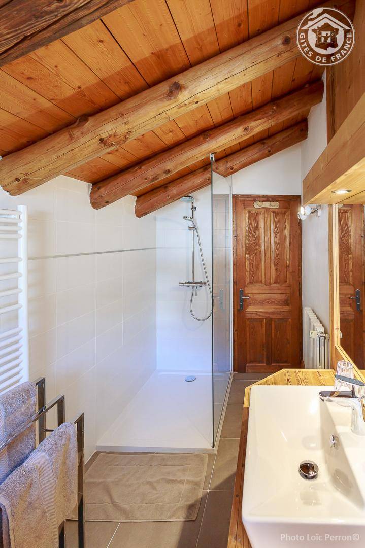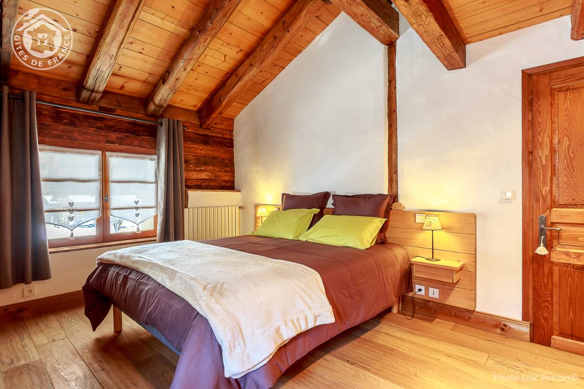 Gîte im Chalet des Eigentümers (mit separatem Eingang), auf 3 Ebenen. Erdgeschoss: Eingangshalle. 1. Stock: Wohnzimmer-Küche-Lounge (Kamin außer Betrieb) mit Balkon-Terrasse, 2 Schlafzimmer jeweils mit eigenem Duschbad (3 Einzelbetten 90 x 200 cm / 1 Doppelbett 160 x 200 cm), separates WC, Waschküche . 2. Stock: ein Wohnzimmer im Zwischengeschoss, 2 Schlafzimmer (3 Einzelbetten 90 x 200 cm / 1 Doppelbett 160 x 200 cm), Duschbad (ebenerdige Dusche mit WC). Gesamtnutzfläche: 206 m² Dachgeschoss inklusive. 3 Balkone + gepflasterter Innenhof + Grundstück. Terrasse, Pétanque-Platz. Bratpfanne. Skilift Les Reys in 100 m Entfernung.