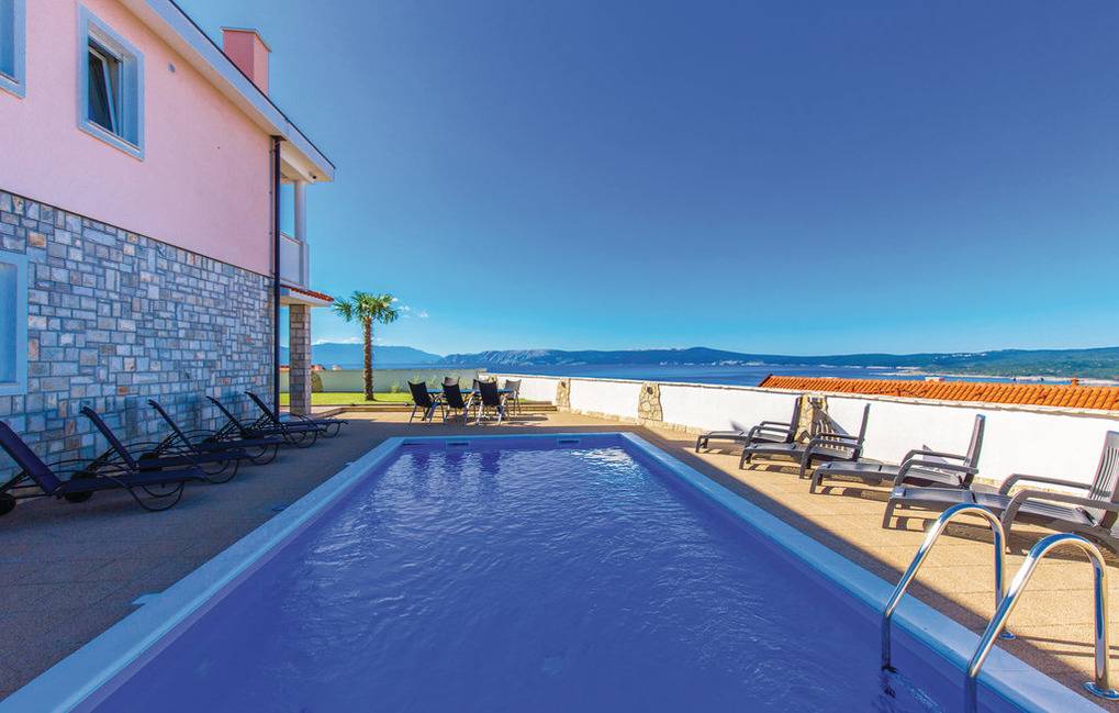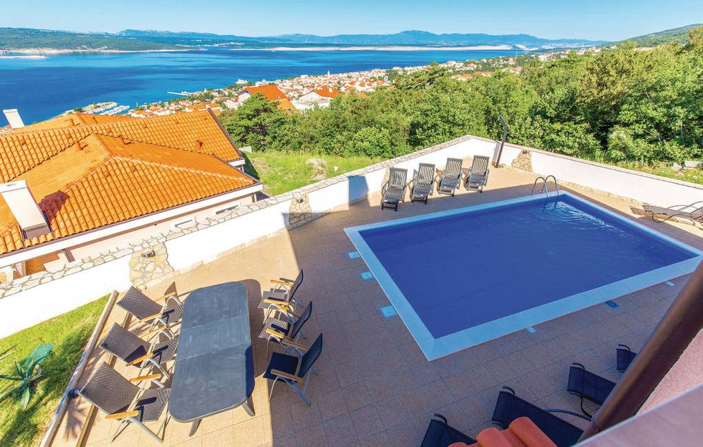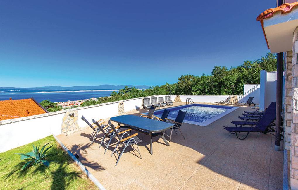 Ferienhaus mit 3 nebeneinander angeordneten Apartments, Terrassen, Balkone, Garten mit Grill, Außenpool (8x4) und Panoramablick auf das Meer die Insel Krk und die Ortschaften Crikvenica, Selce... Jedes Apartment verfügt über einen separaten Eingang, ein klimatisiertes Wohnzimmer mit Küche und Bad im Erdgeschoß sowie die klimatisierten Schlafräume mit eigenen Bädern im Obergeschoß. Vor dem Haus stehen 5 Parkplätze auf Privatgrund zur Verfügung.