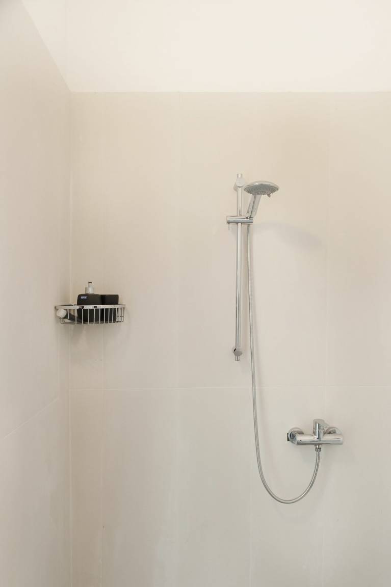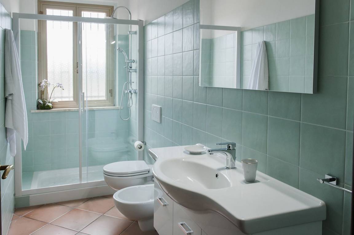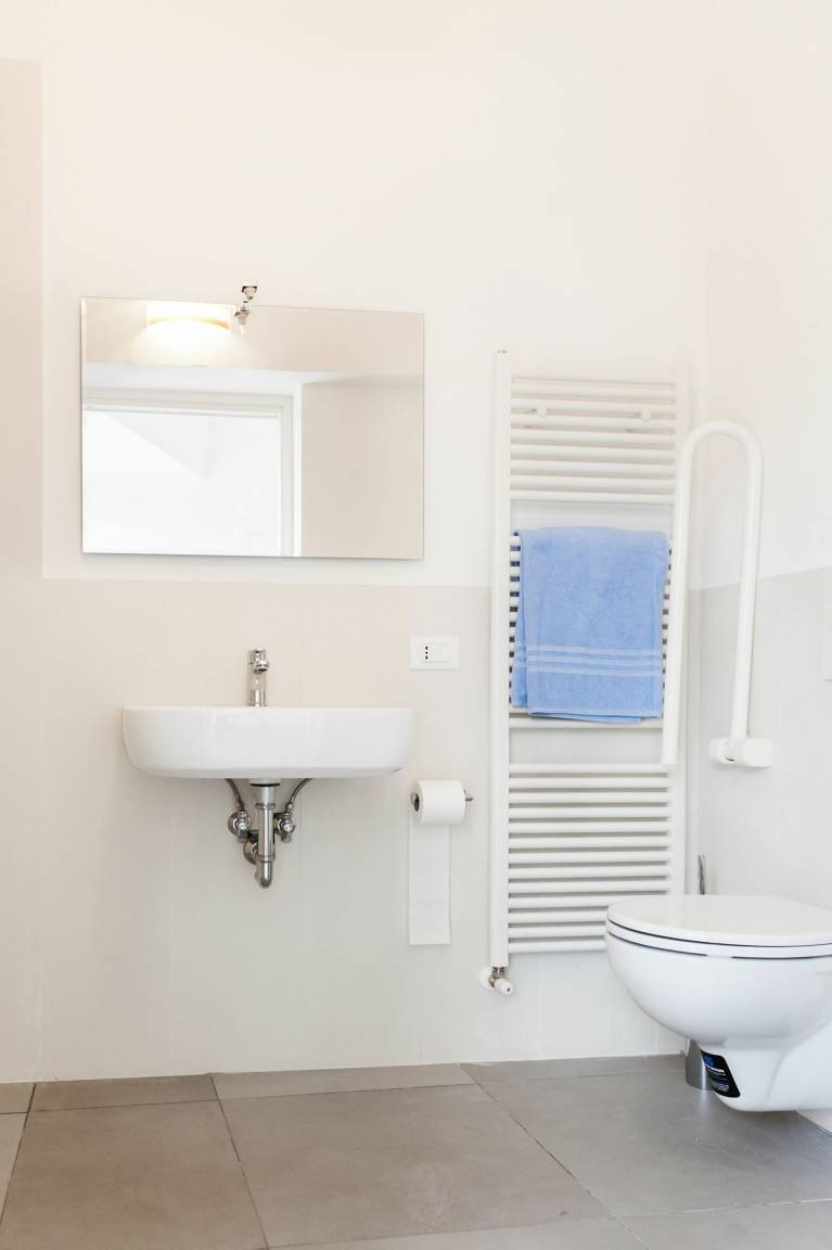 Badezimmer: Waschbecken, WC, Bidet, Dusche, Fön.