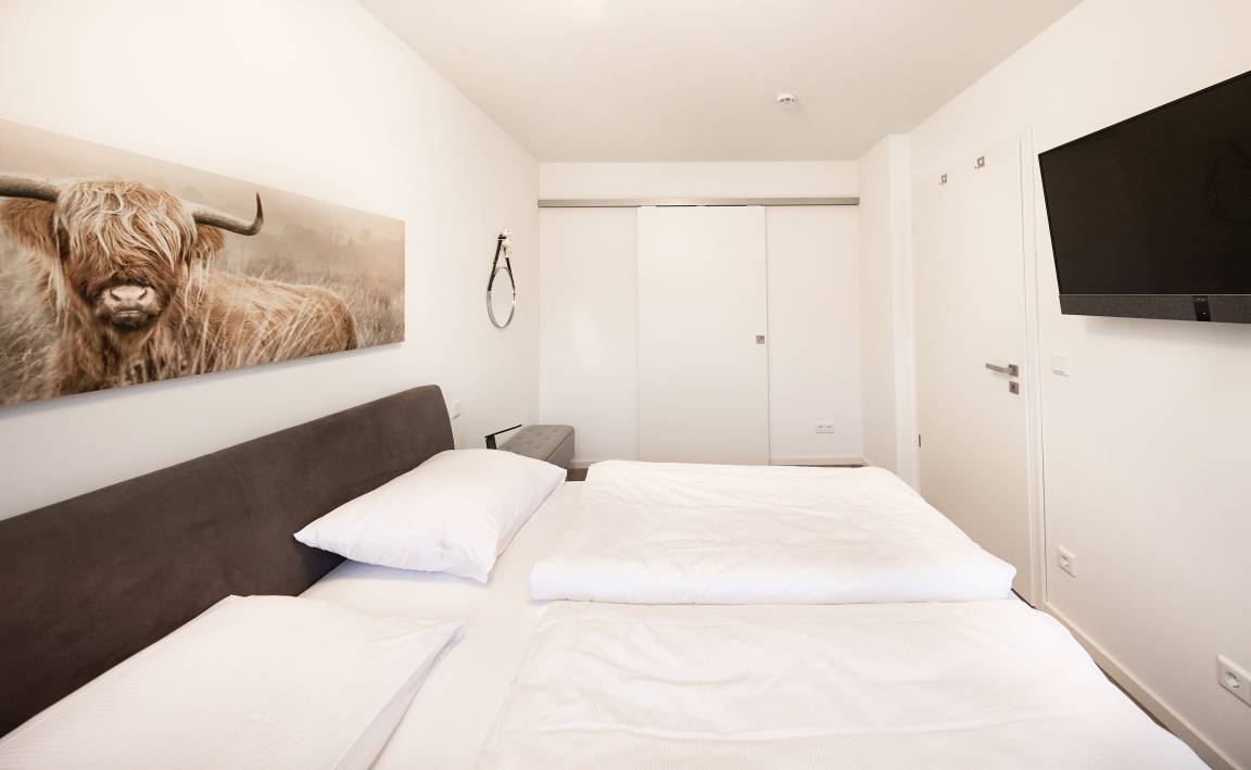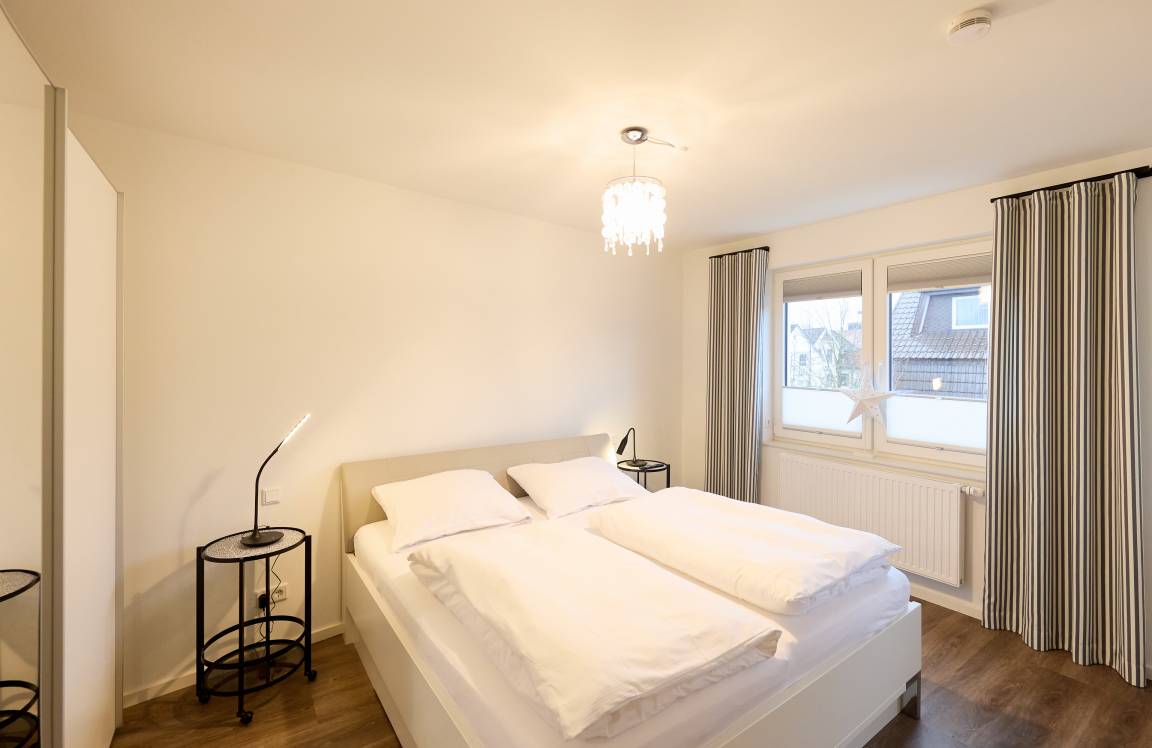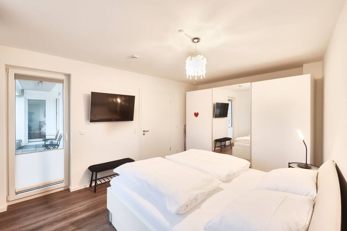 Die großzügige Wohnung bietet auf ca. 82 m² Platz für bis zu 4 Personen und umfasst zwei gemütliche Schlafzimmer. Das erste Schlafzimmer ist mit einem Doppelbett und einem begehbaren Kleiderschrank ausgestattet, während das zweite Schlafzimmer ebenfalls ein komfortables Doppelbett bietet. Beide Schlafzimmer haben direkten Zugang zum West-Balkon, von dem aus Sie den Abend bei einem atemberaubenden Blick ausklingen lassen können.
