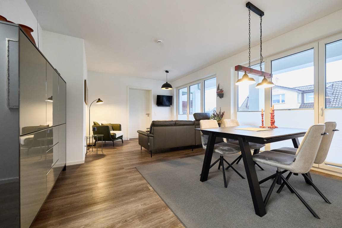 Der zentrale Wohn- und Essbereich ist perfekt für gemeinschaftliche Stunden. Hier finden Sie einen TV, DAB+ Radio und kostenfreies WLAN, damit Sie sich rundum wohlfühlen. Die komfortable Einbauküche ist voll ausgestattet und lässt keine Wünsche offen – ideal für die Zubereitung von Mahlzeiten, die Sie im Essbereich genießen können.