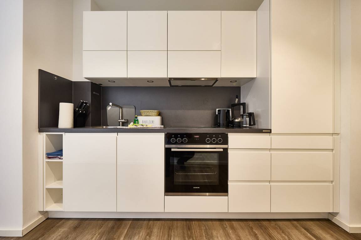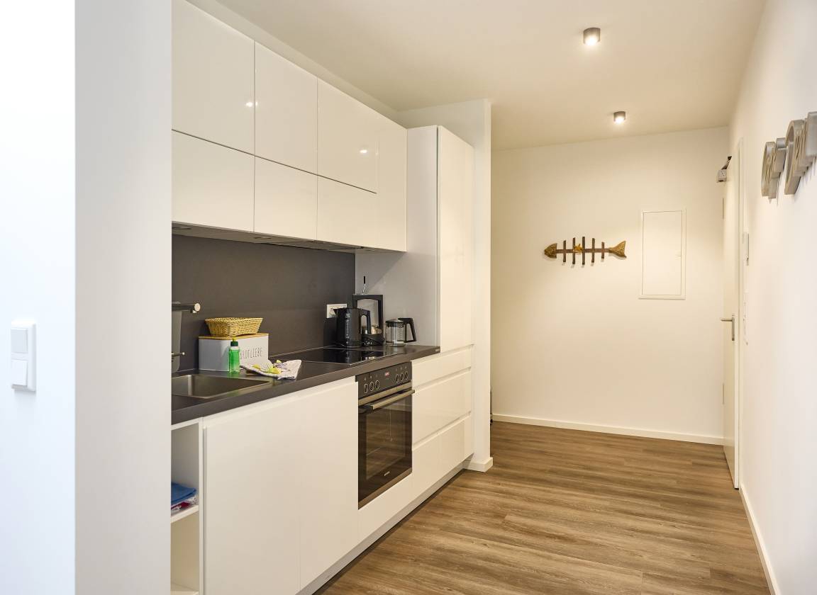 Küche: Induktionskochfeld, Mikrowelle, Geschirrspüler, Kühlschrank mit Gefrierfach