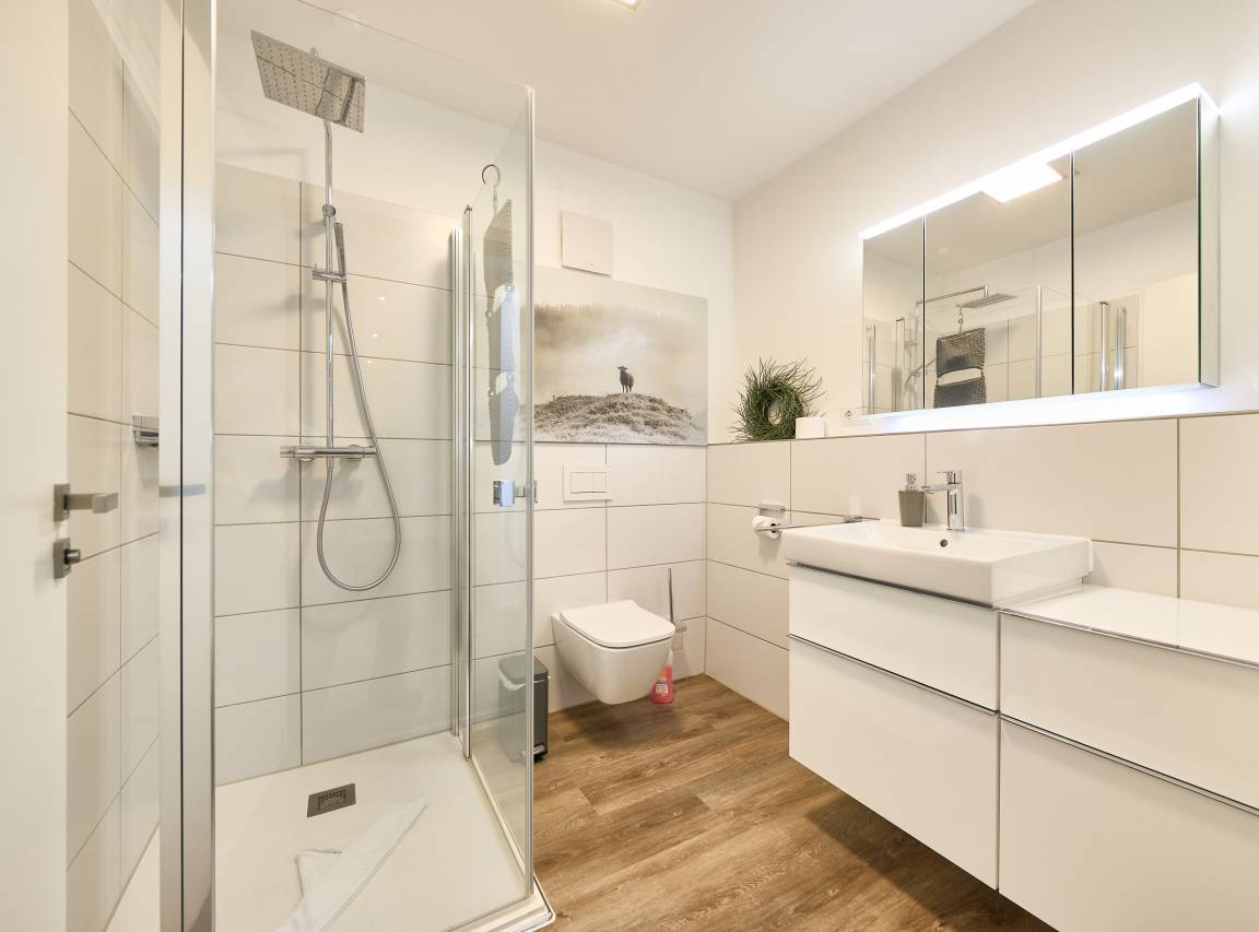 Duschbad: Modernes Bad mit ebenerdiger Dusche, WC, Handtuchheizkörper
