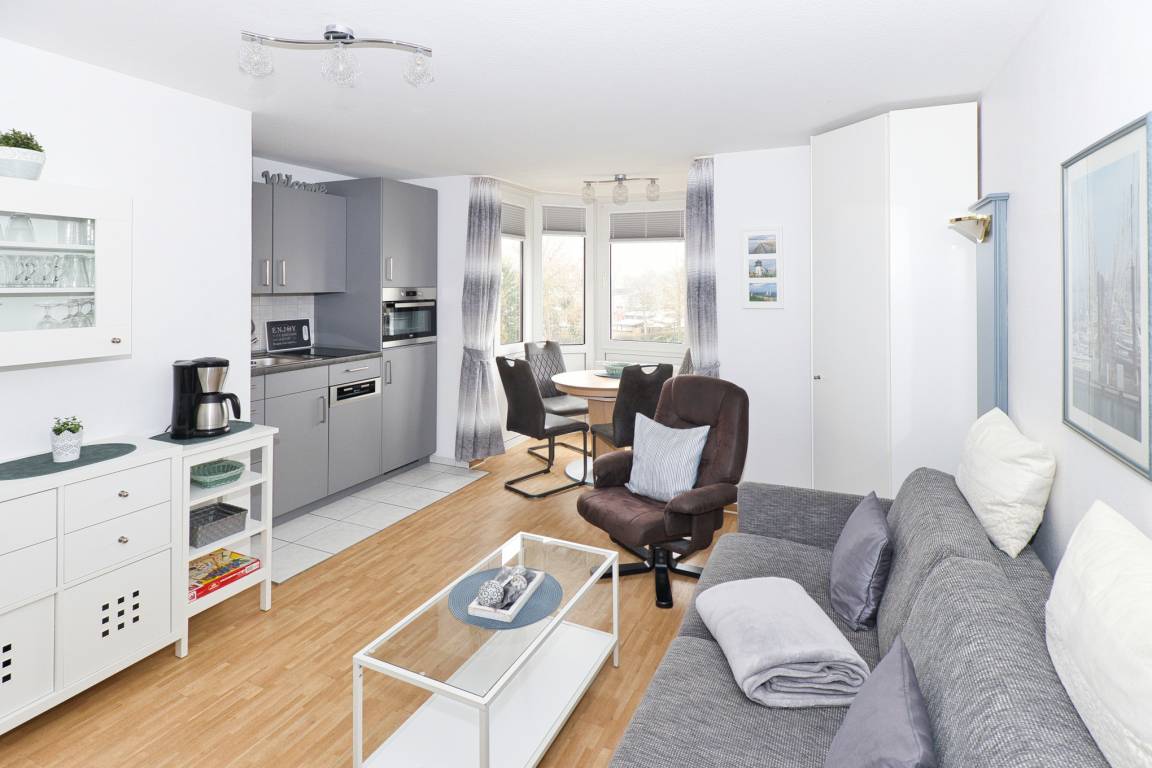Diese lichtdurchflutete 2-Zimmer-Wohnung mit West-Balkon und gemütlichem Fenstersitzplatz erstreckt sich über großzügige 44 m² und ist für 2-4 Personen eingerichtet. Der gemütliche Wohnbereich bietet Platz für bis zu 4 Personen, wobei die optimale Belegung für 2 Personen ist. Sollten Sie jedoch mit bis zu 4 Personen reisen, verwandelt sich das Sofa in ein komfortables Schlafsofa. Im Wohnbereich finden Sie ausreichend Stauraum für die persönlichen Dinge des 3. und 4. Gastes.