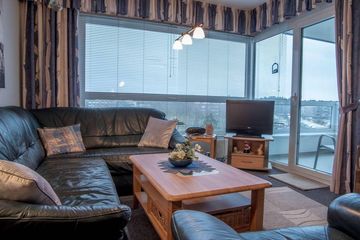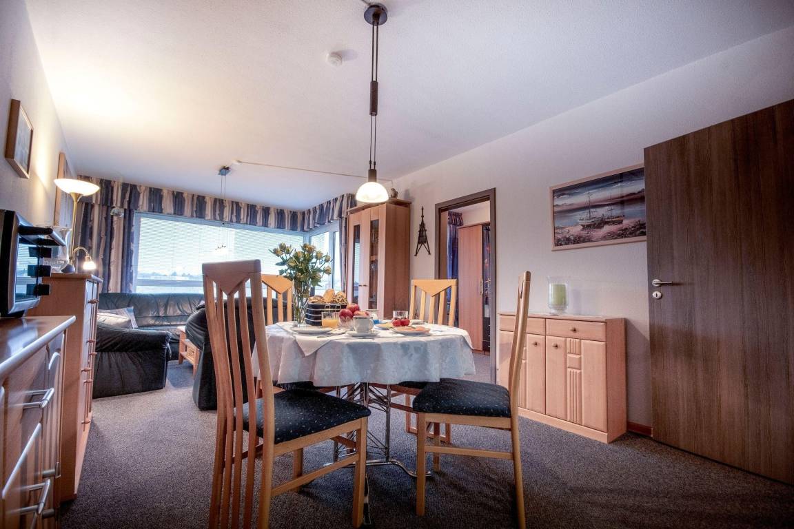 Die strandnahe 2-Zimmer Ferienwohnung im 3. Obergeschoss bietet eine gemütliche Einrichtung und einen schönen Blick über das Sahlenburger Wattenmeer sowie den Wernerwald. Die Wohnung umfasst ein helles Wohn- und Schlafzimmer, ausgestattet mit komfortablen Möbeln, die zum Entspannen einladen.