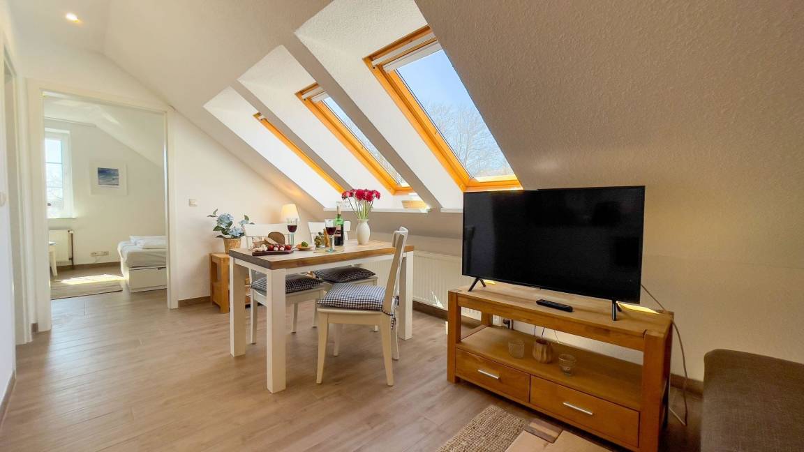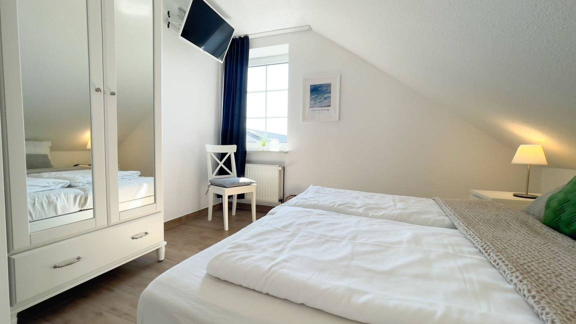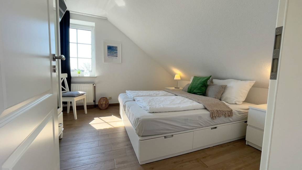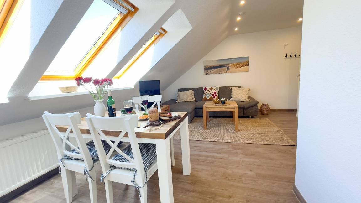 Die Ferienwohnung „Haus Kirsten FeWo 6" ist eine charmante Unterkunft an der Nordseeküste und bietet auf 40 m² Platz für bis zu vier Personen. Sie befindet sich im ersten Stock eines freistehenden Hauses. Der Wohnbereich ist mit einem komfortablen Schlafsofa und einem Esstisch ausgestattet, während das separate Schlafzimmer ein gemütliches Doppelbett beherbergt.