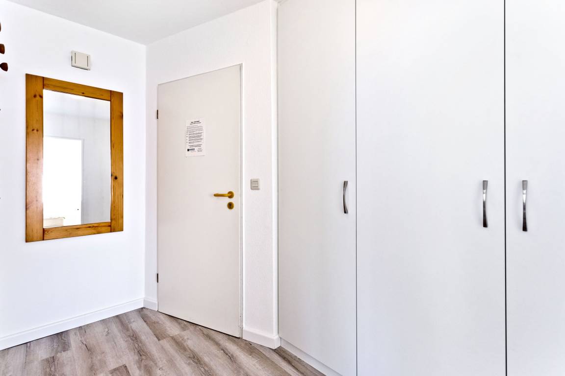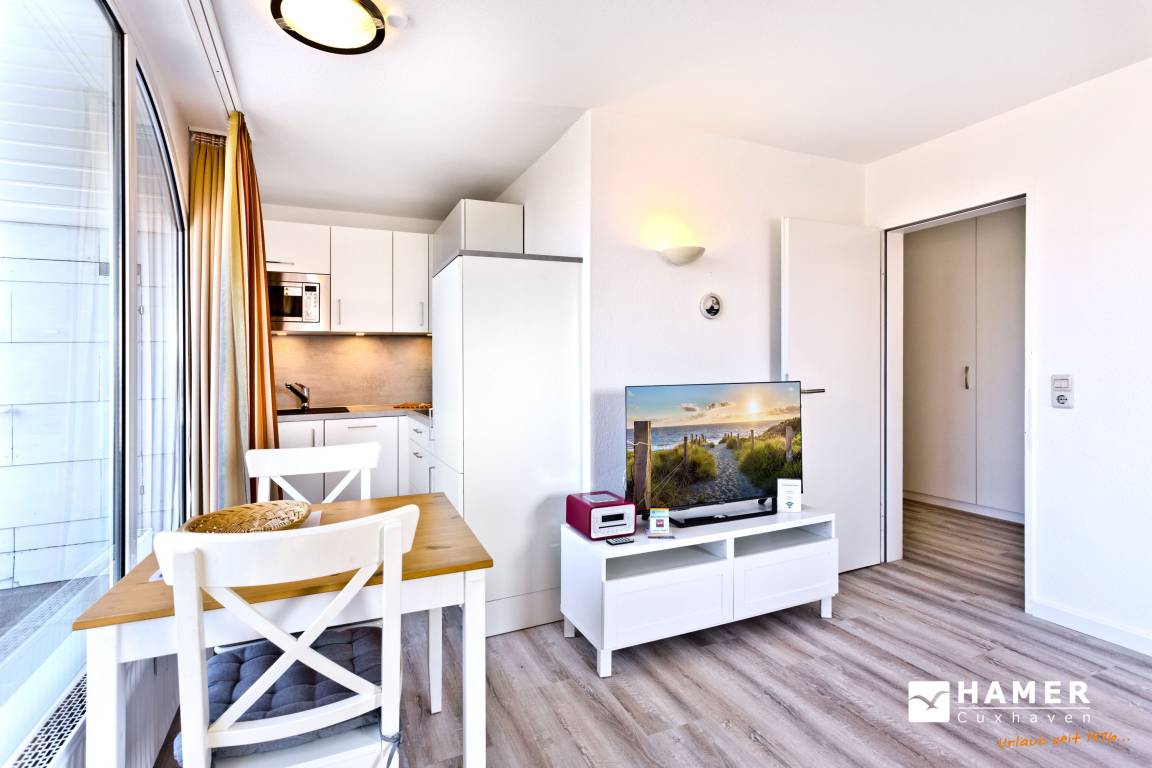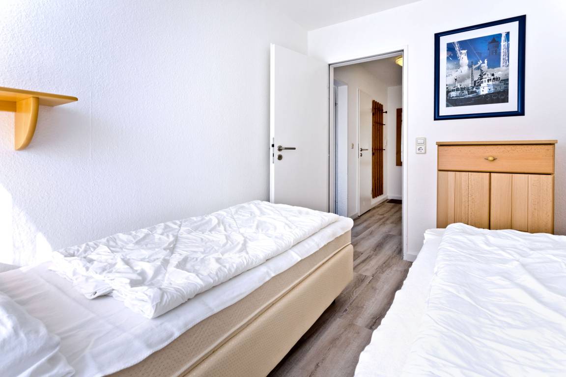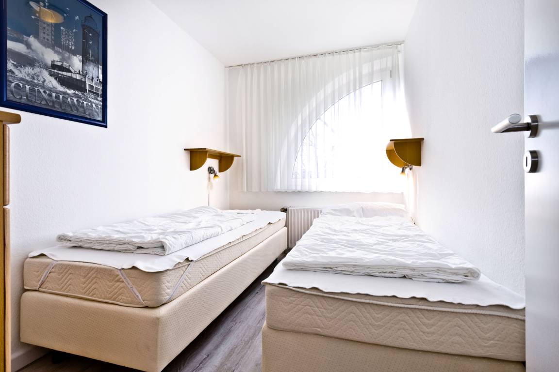 Renovierte 2-Raum-Eckwohnung auf ca. 35m², 4. Etage, komplett ausgestattet bis 2 Pers., 1 Schlafzimmer mit 2 Einzelbetten, 1 kombiniertes Wohn/Schlafzimmer mit Schlafcouch, SAT-TV und Sonoro-Radio, kostenloses W-Lan, neue Küchenzeile mit Geschirrspüler [&] Mikrowelle, Dusche/WC, Flur, Dachterrasse (west), reservierter Pkw-Stellplatz #412 auf dem Außengelände, keine Haustiere gestattet und natürlich Nichtraucher.