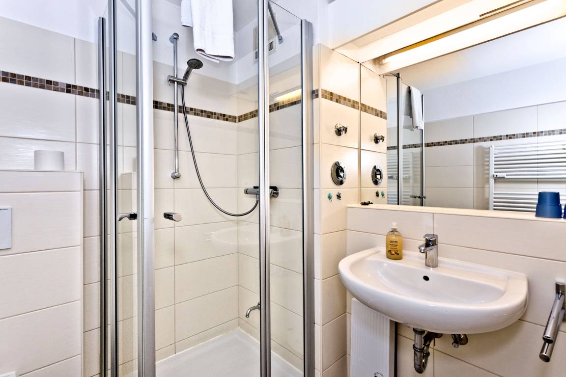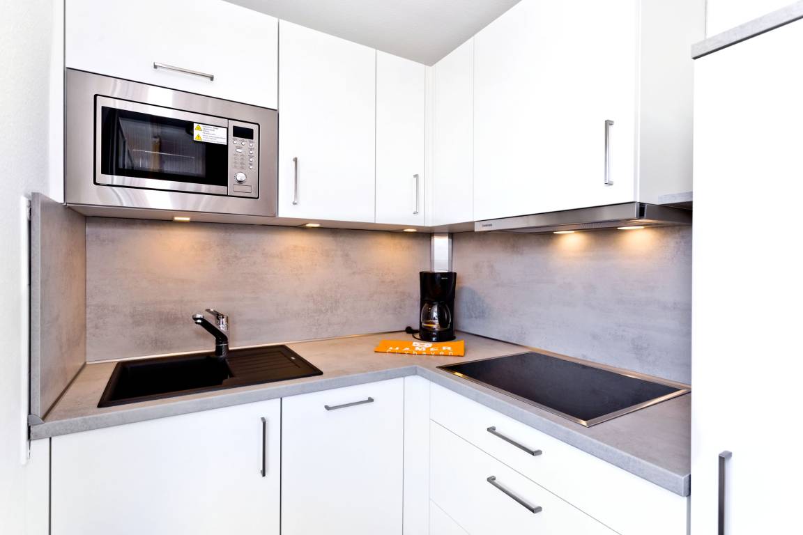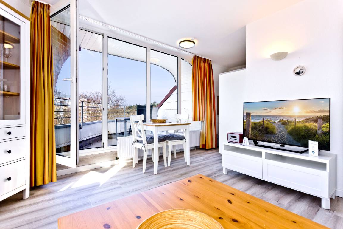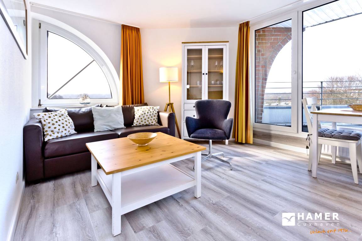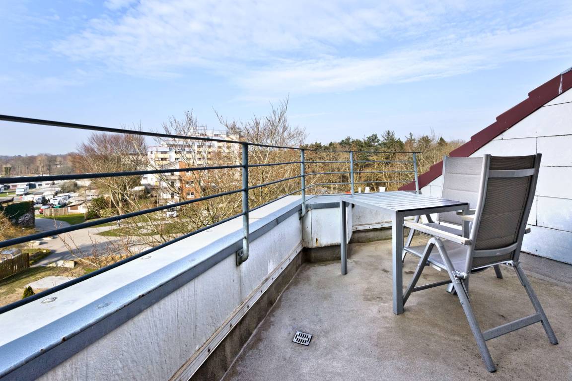 Renovierte 2-Raum-Eckwohnung auf ca. 35m², 4. Etage, komplett ausgestattet bis 2 Pers., 1 Schlafzimmer mit 2 Einzelbetten, 1 kombiniertes Wohn/Schlafzimmer mit Schlafcouch, SAT-TV und Sonoro-Radio, kostenloses W-Lan, neue Küchenzeile mit Geschirrspüler [&] Mikrowelle, Dusche/WC, Flur, Dachterrasse (west), reservierter Pkw-Stellplatz #412 auf dem Außengelände, keine Haustiere gestattet und natürlich Nichtraucher.