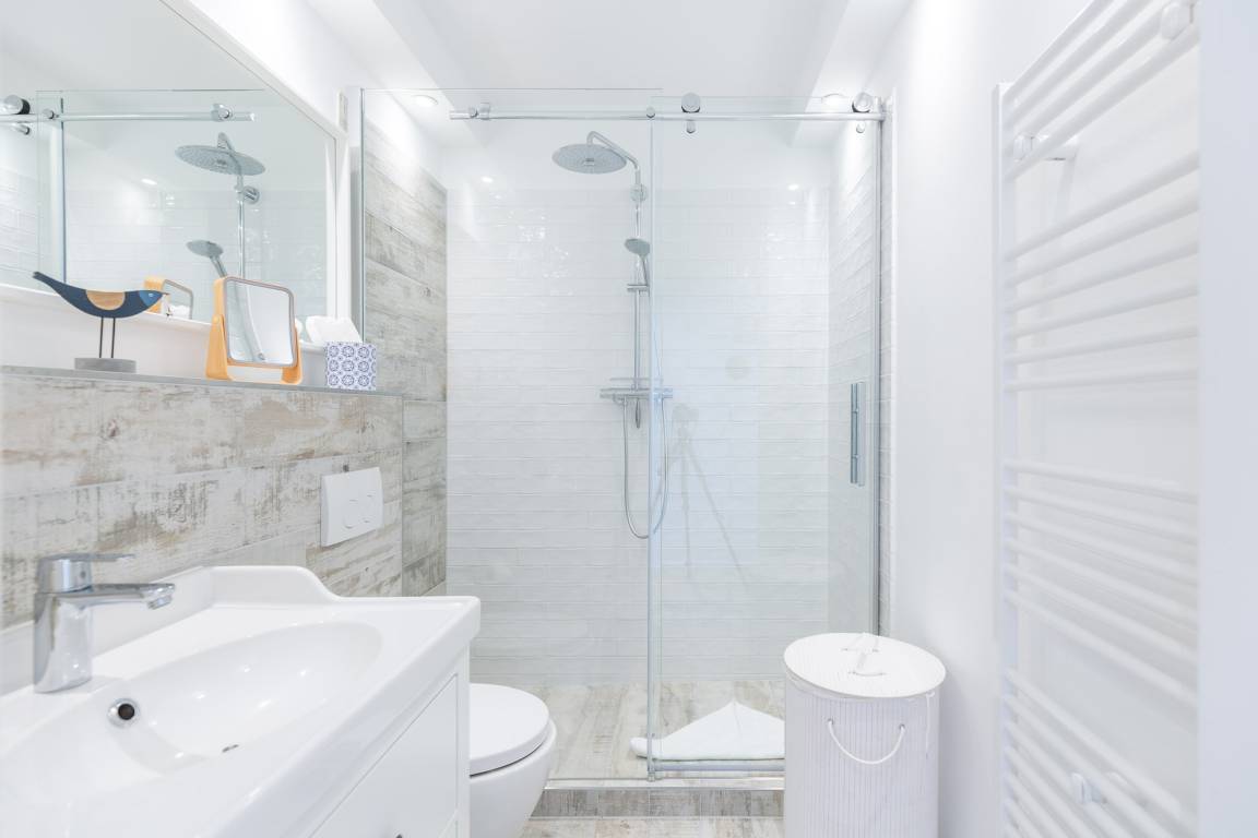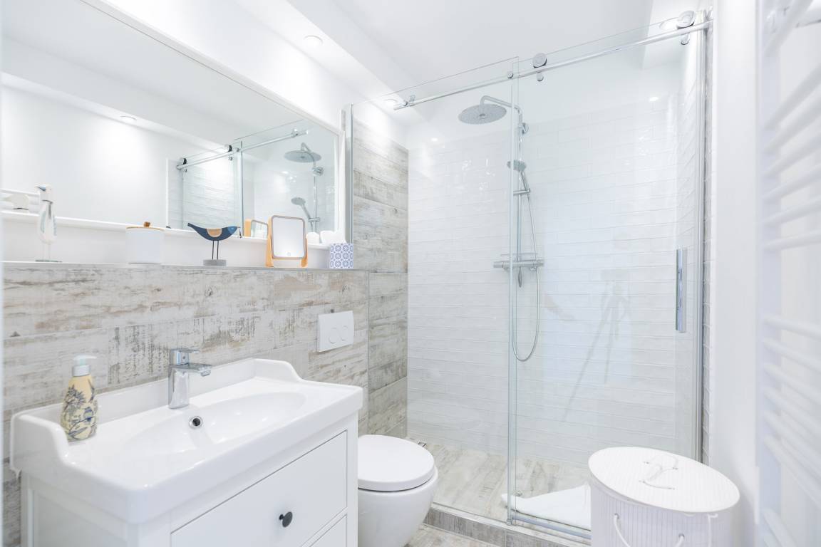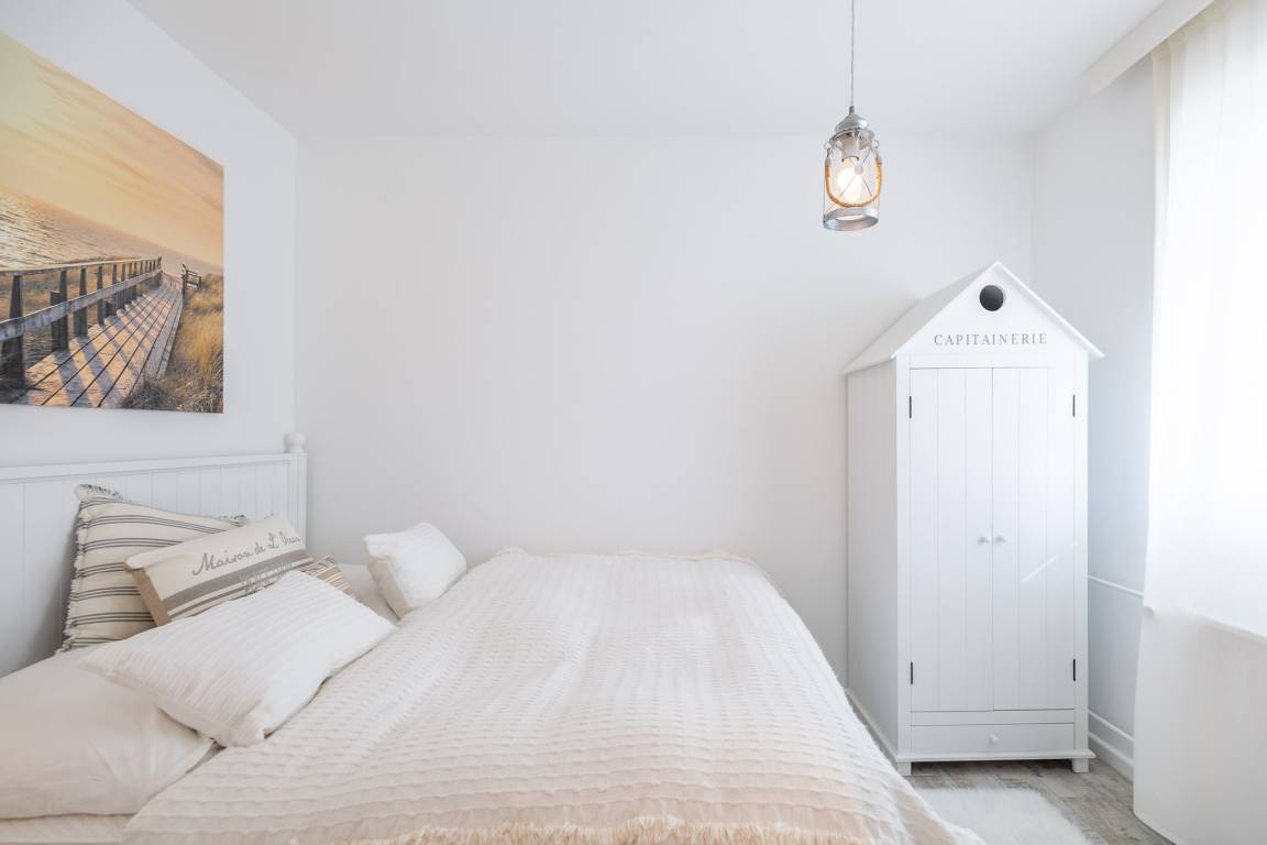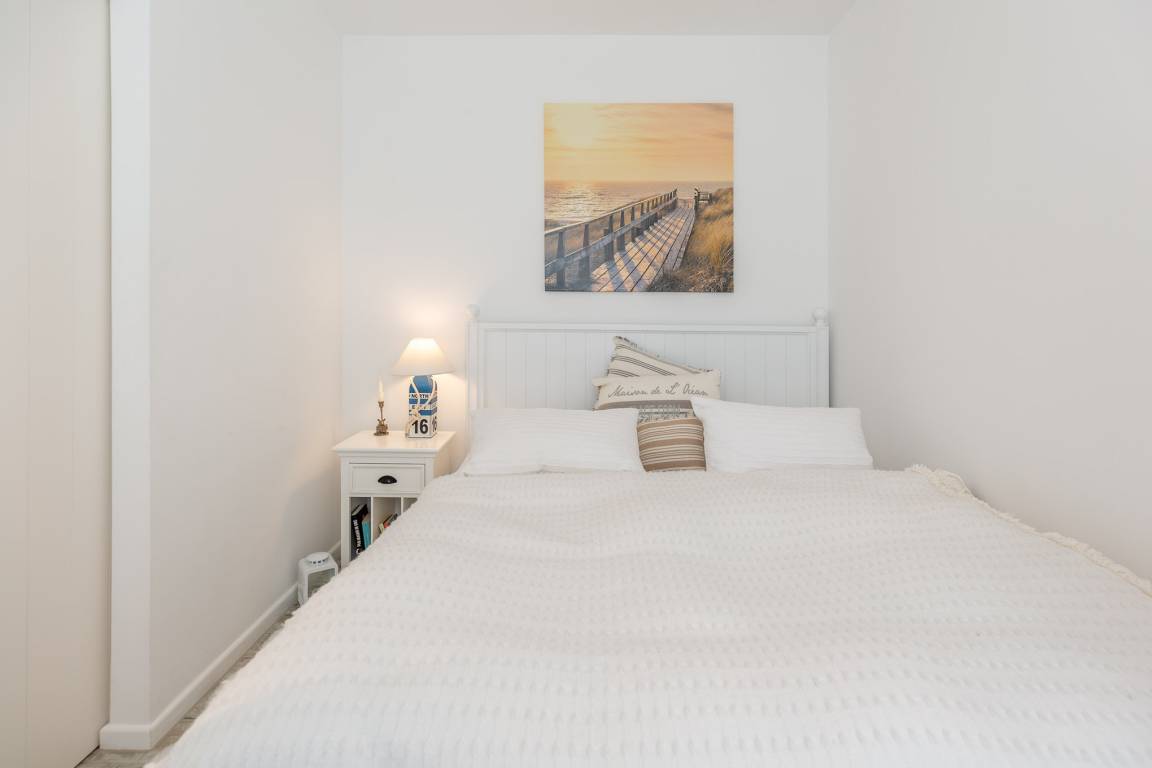 Das separate Schlafzimmer mit Doppelbett gewährleistet einen erholsamen Schlaf und verfügt über Wendematratzen mit unterschiedlichem Härtegrad. Außenjalousien sorgen dafür, dass Sie nicht von der Morgensonne geweckt werden. Darüber hinaus ist das Schlafzimmer mit Insektenschutzgittern ausgestattet. Das moderne Bad bietet eine Regendusche. Zudem können Sie auf dem möblierten Balkon die frische Nordseeluft spüren, den Ausblick genießen und die Zeit vergessen. Zur Wohnung gehört eine Garage (2,06 m Höhe, 2,20 m Breite (Garagentor) und ca. 5,00 m Länge).