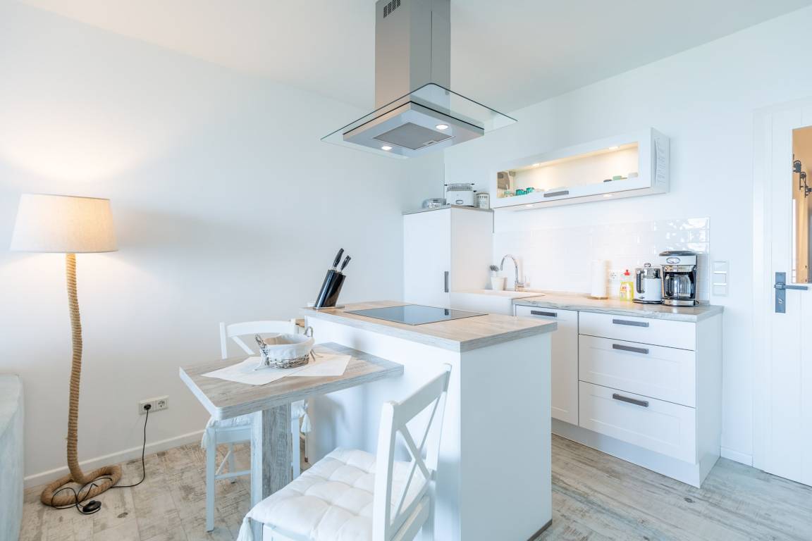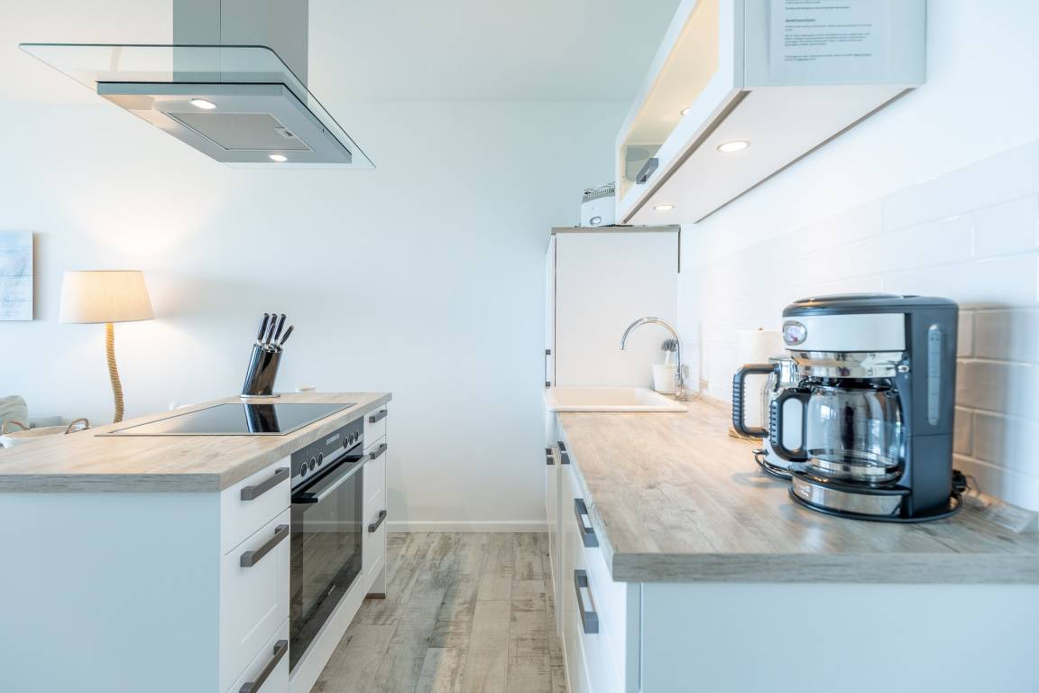 Darüber hinaus bietet der kombinierte Wohn- und Essbereich eine Küchenzeile mit Backofen und Geschirrspüler. Am 4-Zonen Ceranfeld können Sie selbst beim Kochen den atemberaubenden Ausblick genießen. Eine Kaffeemaschine, Wasserkocher und weitere Küchenutensilien sind ebenfalls vorhanden.