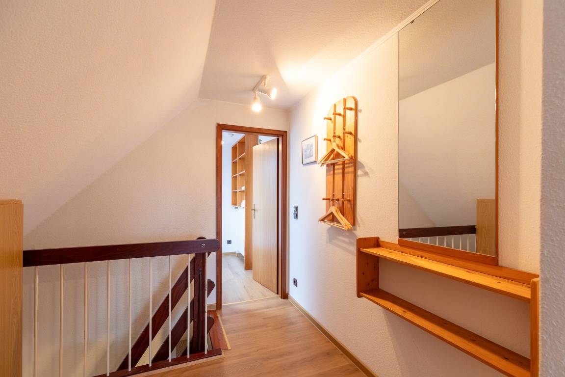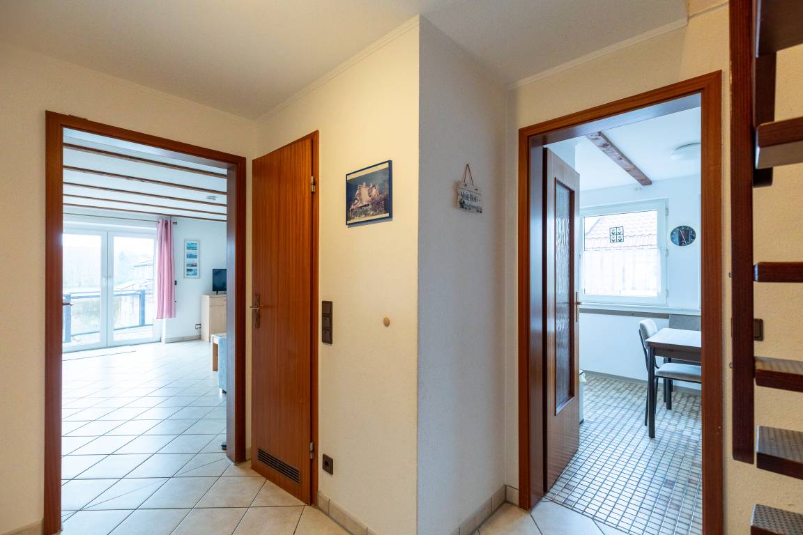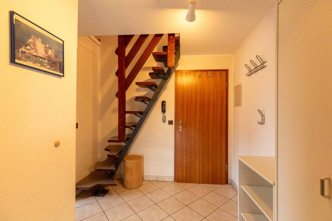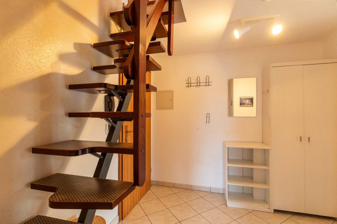 Die Wohnung verfügt über ein Wohnzimmer (mit 2 Schrankbetten), eine Küche mit Sitzecke und 4 Platten-Herd, zwei Schlafräume im Obergeschoss (erreichbar über eine Raumspartreppe) und ein Bad mit Dusche/WC.