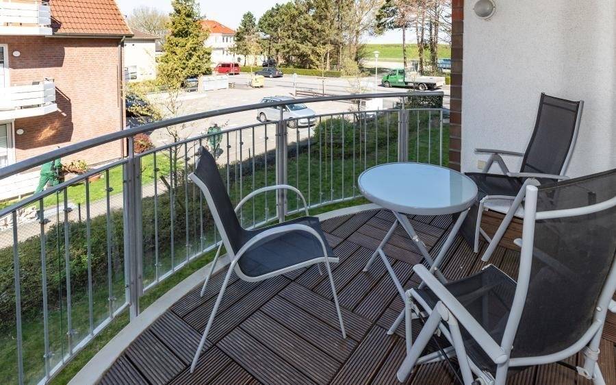 Balkon zur Westseite – mit Teilseesicht zwischen den Bäumen, Glaselement als Windschutz