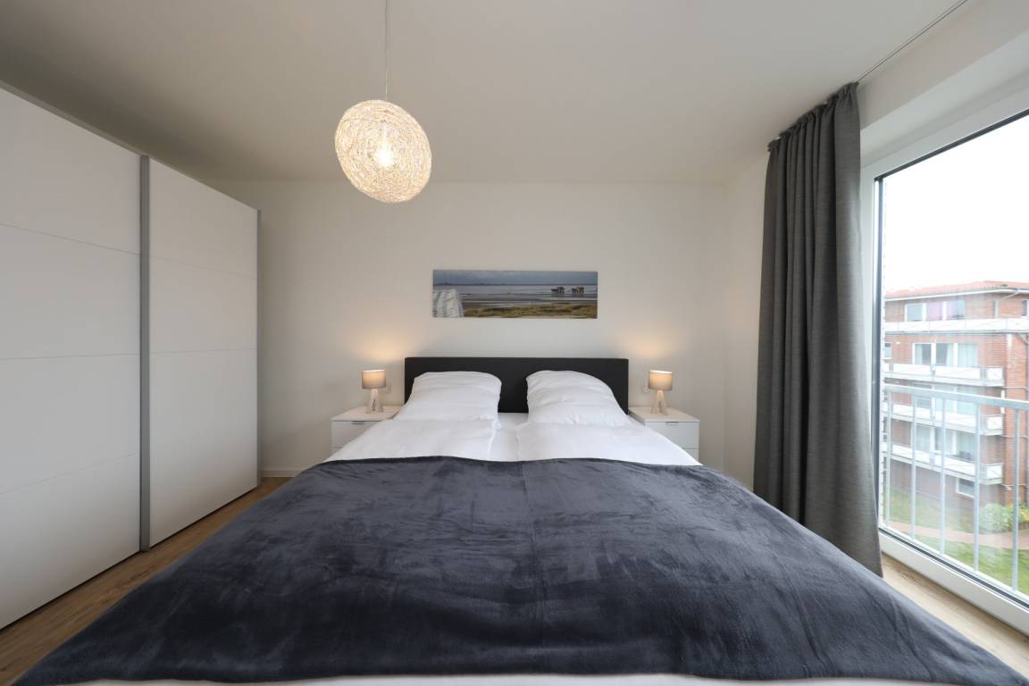 Das Schlafzimmer punktet mit einem gemütlichen Boxspringbett (180 x 200 cm) und Verdunklungsgardinen. Zwei weitere Gäste können bequem auf der hochwertigen Schlafcouch im Wohnzimmer (160 x 200 cm) übernachten. Auch hier sind Verdunklungsgardinen vorhanden.