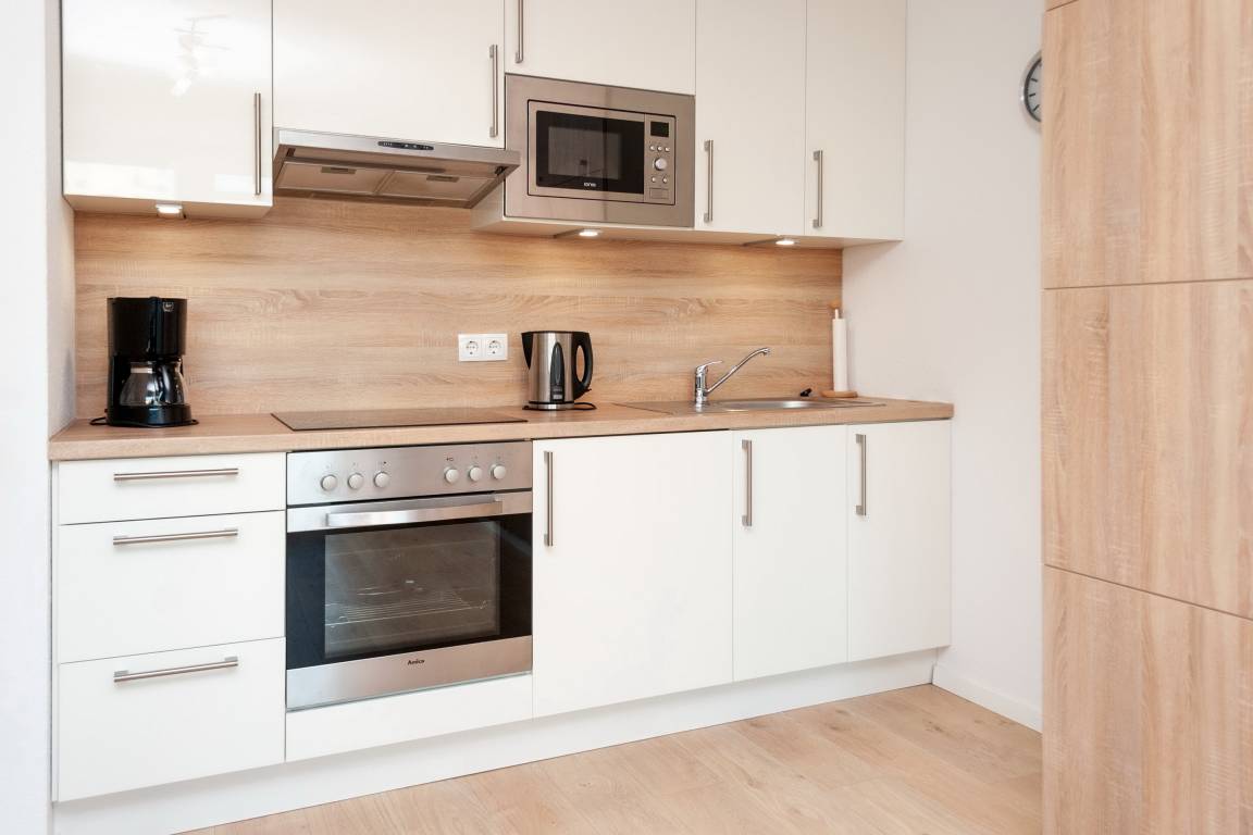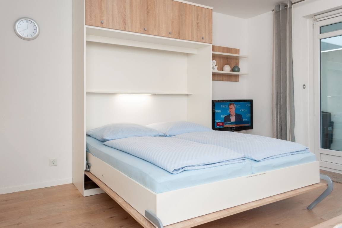 Das Apartment besteht aus einem Schlafzimmer mit 2 Einzelbetten, einem Wohnbereich mit zusätzlichem Schrankbett für 2 Personen und einem Badezimmer mit Dusche sowie WC. Die Ferienwohnung beinhaltet eine voll ausgestattete offene Küche.