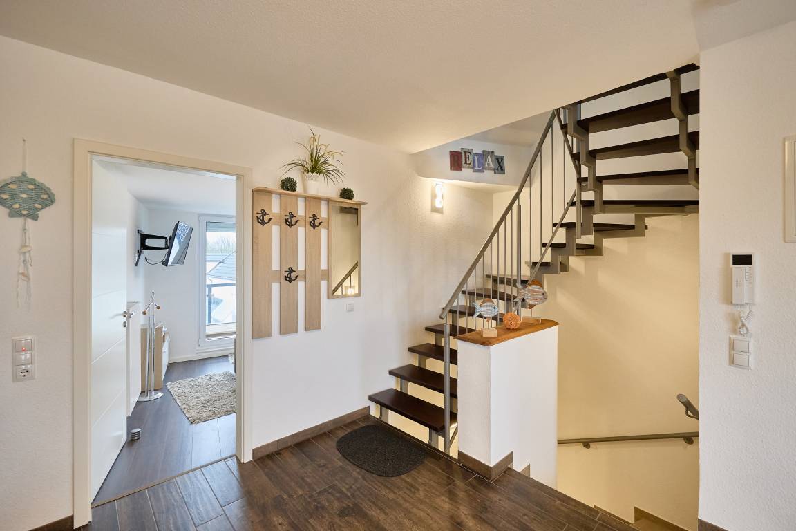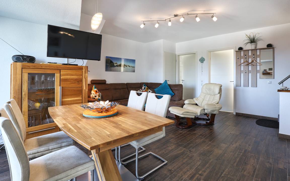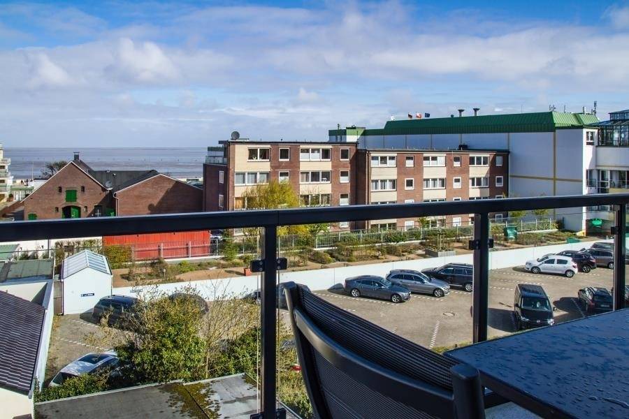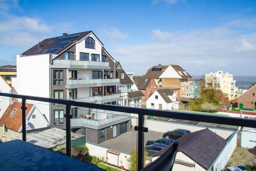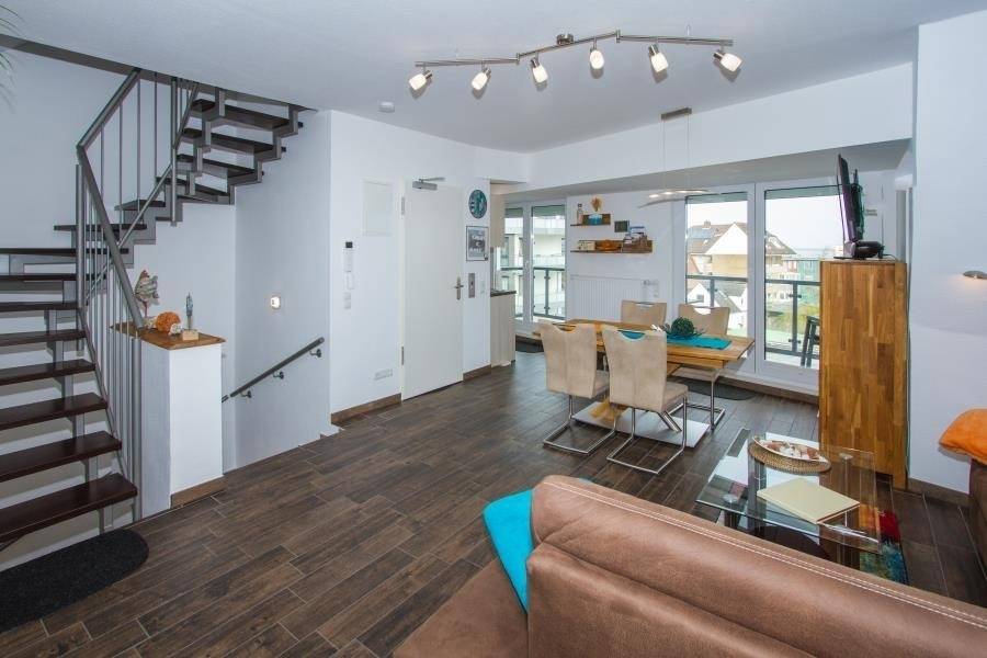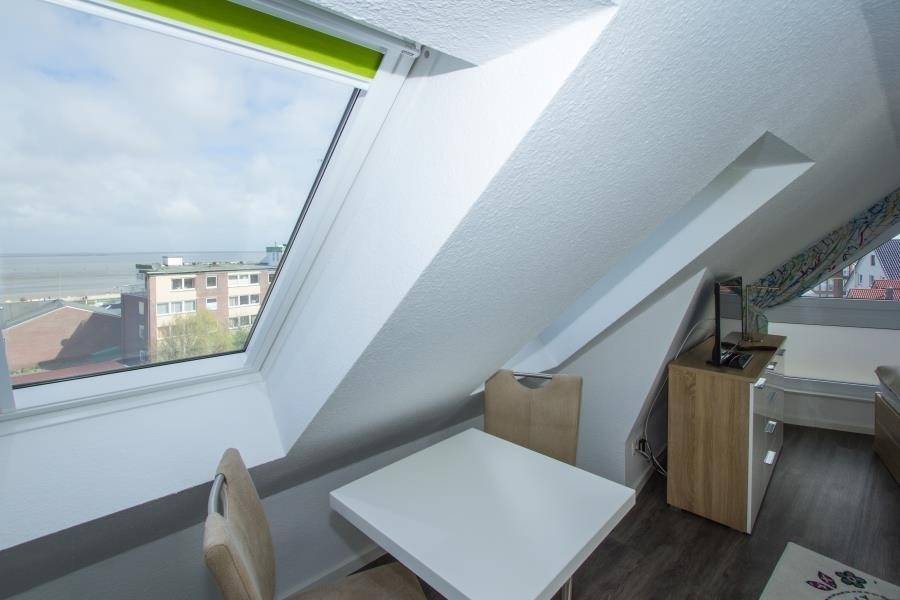 Die Ferienwohnung Nr. 4 befindet sich im zweiten Gebäude in der zweiten Reihe und erstreckt sich über zwei Etagen. Sie bietet Platz für bis zu vier Personen, maximal fünf Personen, wenn im Dachgeschoss ein Bett von zwei Kindern genutzt wird. Der Wohn- und Essbereich liegt im dritten Obergeschoss und überzeugt mit modernem Design und einer gemütlichen Atmosphäre. Eine offene Einbauküche mit allem Komfort – darunter ein Ceranfeld, Backofen und Geschirrspüler – ist nahtlos in den Wohnbereich integriert und ideal für die Zubereitung gemeinsamer Mahlzeiten. Vom Balkon aus genießen Sie eine traumhafte Seesicht über die Dächer von Duhnen – der perfekte Ort für ein entspanntes Frühstück oder einen erholsamen Abend.