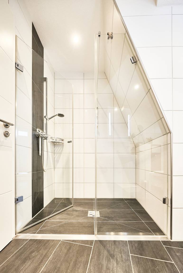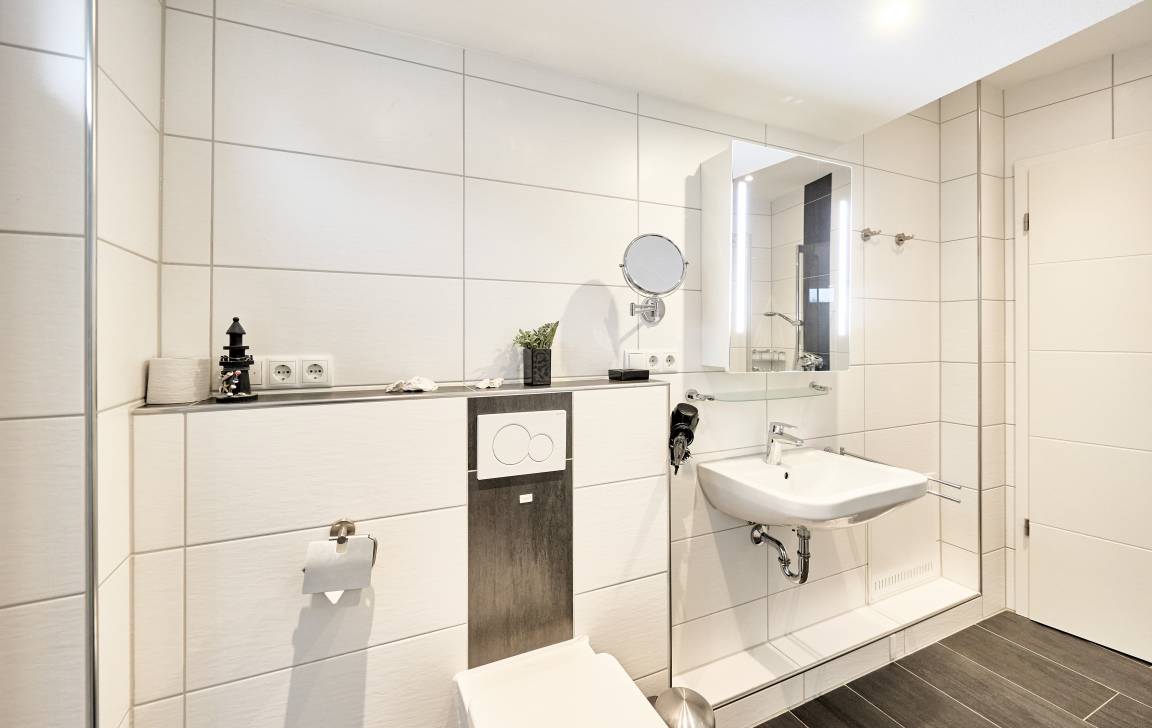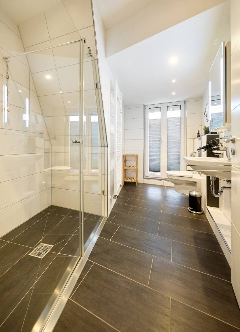 Auf dieser Etage befinden sich außerdem ein Schlafzimmer mit Doppelbett, das Zugang zu einem Südbalkon bietet, sowie ein helles Duschbad mit Fenster. Das Badezimmer ist mit einer bodengleichen Dusche, einem modernen WC und hochwertigen Details ausgestattet.