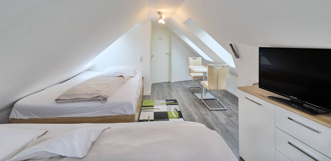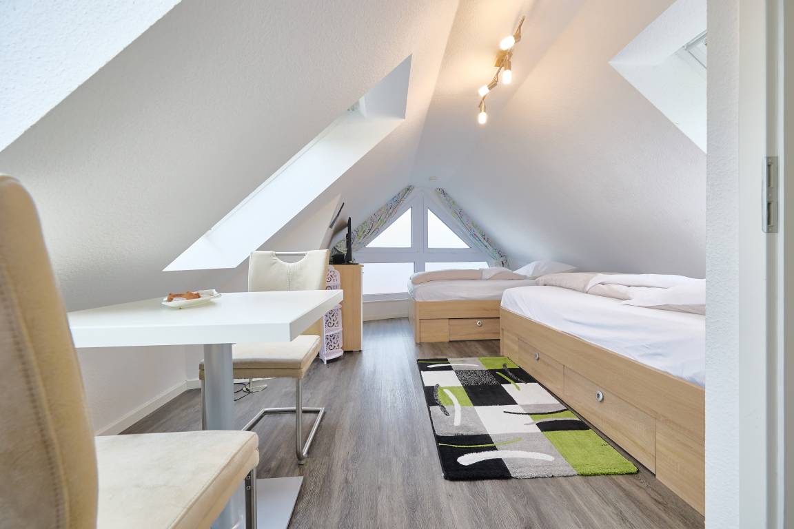 Im Dachgeschoss erwartet Sie ein weiterer Schlafbereich, der mit zwei Einzelbetten, einem kleinen Tisch mit Stühlen und einem zusätzlichen TV eingerichtet ist. Dieser Bereich ist ideal für Kinder ab zehn Jahren, jedoch aufgrund der Gegebenheiten nicht für Kleinkinder geeignet.