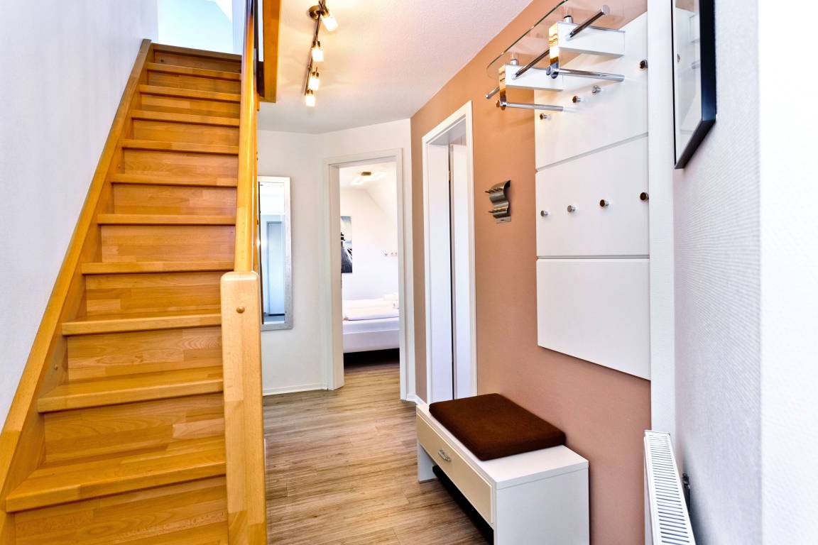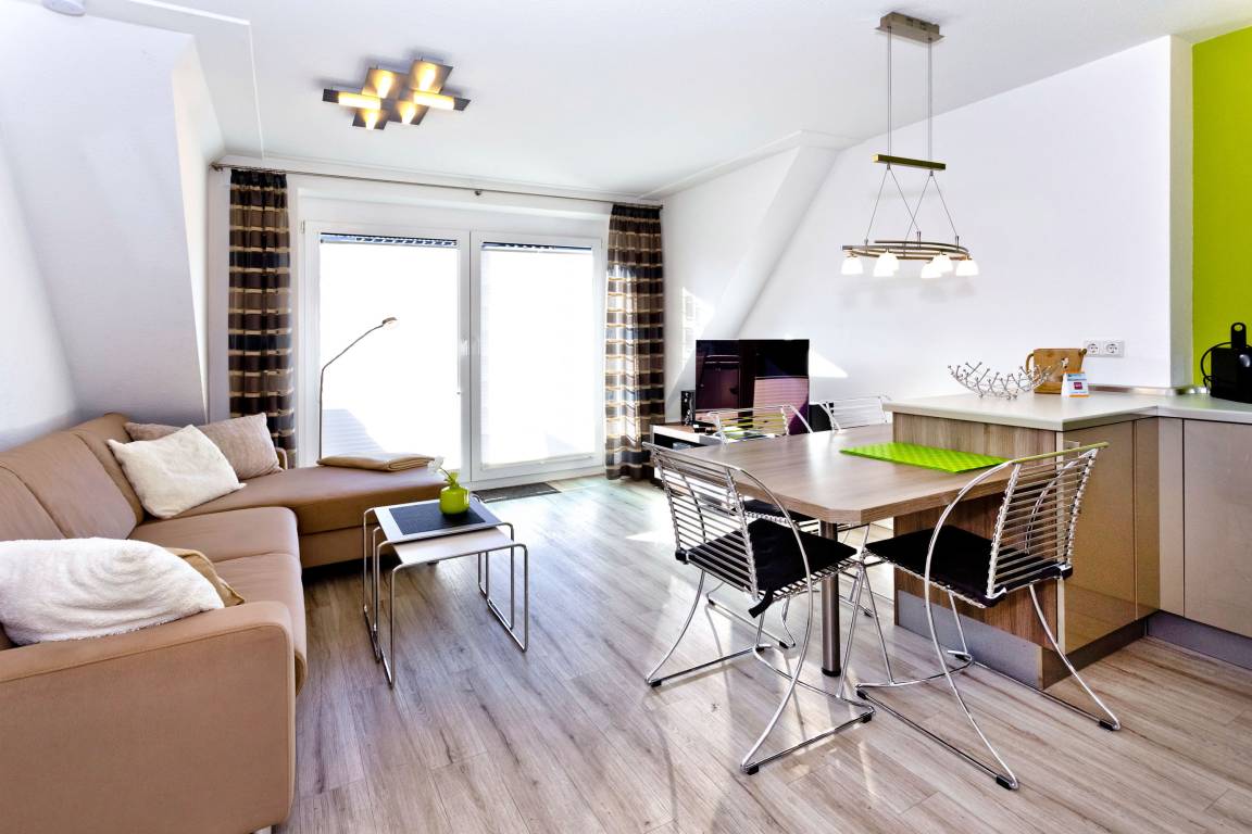 Sehr schöne 3-Raum-Maisonette-Wohnung (ca. 62m²), 2.Etage, 1 Schlafzimmer mit Doppelbetten - Rollläden, 1 Schlafzimmer im Dachgeschoss mit zwei Einzelbetten - Plissees, teilweise mit Insektenschutz, 1x Du/Wc mit Föhn, 1x Gäste-Wc, Wohnzimmer mit großer Küchenzeile (Back., Mikrowelle, Geschirrspüler) 2xSAT-TV, Stereo, kostenloses W-LAN-Internet, großer Balkon (süd) mit Markise, Rollläden, reservierter Pkw-Stellplatz #18, Nichtraucher und keine Haustiere gestattet.