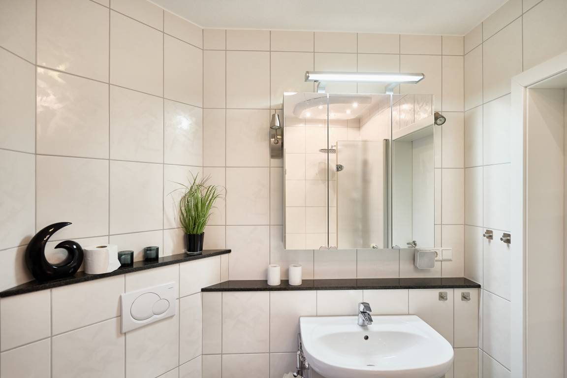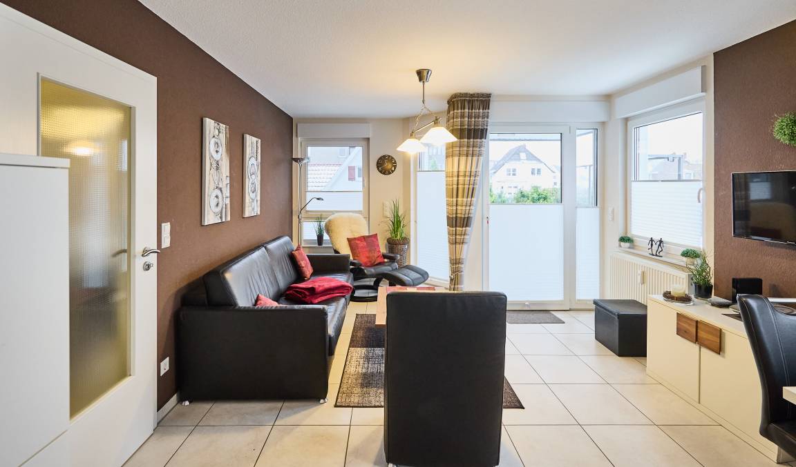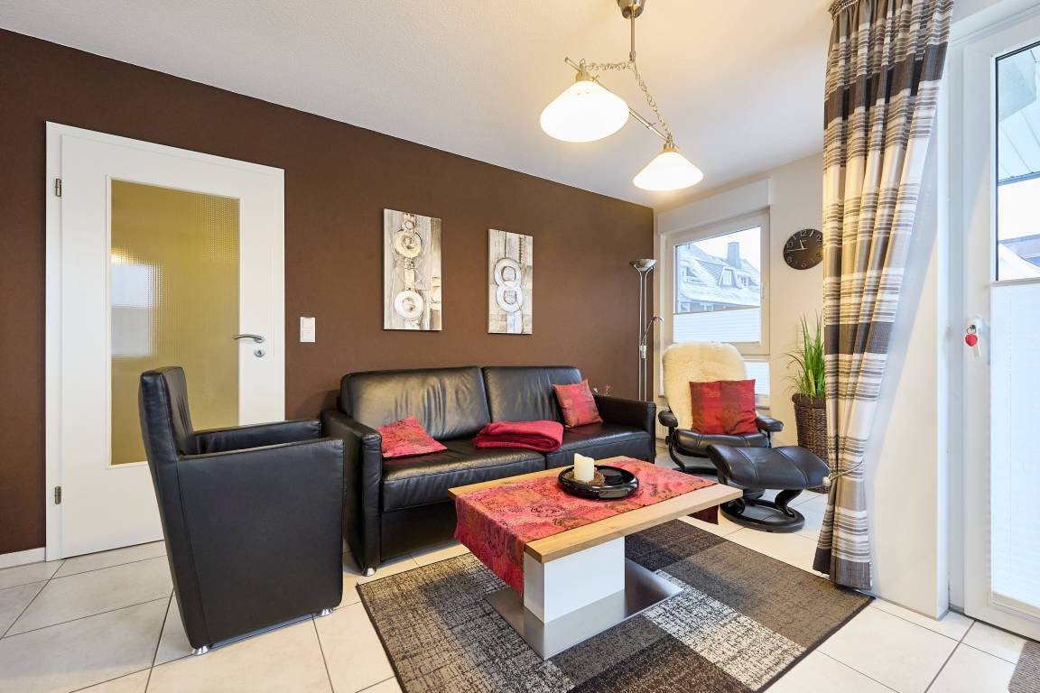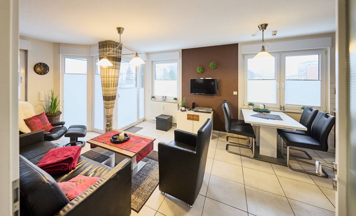 Diese sehr schöne und hochwertig eingerichtete Ferienwohnung (Wohn- und Essbereich mit einer Schlafcouch mit einem vollwertigen Bettauszug, Flur und Duschbad komplett Allergiker freundlich) unmittelbar am ahoi! Bad gelegen, ist mit einem gemütlichen Schlafzimmer mit großem Kleiderschrank, einem barrierefreien Duschbad (Dusche/WC), einem Abstellraum (für Ihre Koffer befindet sich noch ein Abstellraum im Kellerbereich des Hauses) aufgeteilt. Im Wohn- und Essbereich mit einer sehr gut ausgestatteten Einbauküche und dem barrierefreien Zugang zum Balkon mit Windschutz (mit Balkonmöbeln und einem kleinen Strandkorb) können Sie den Tag genießen.