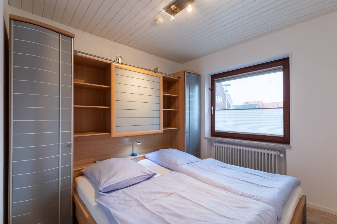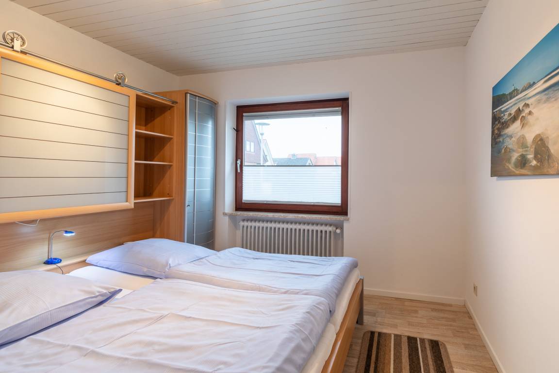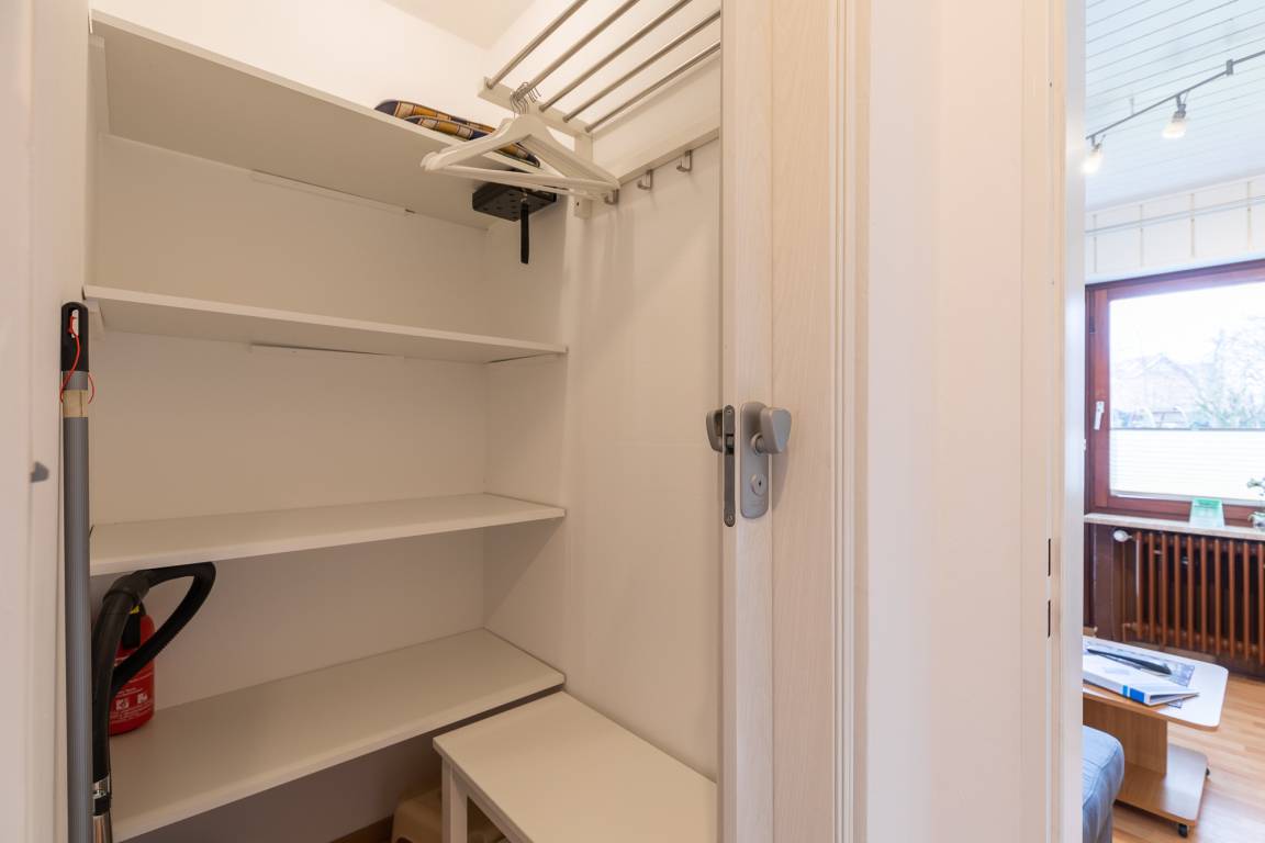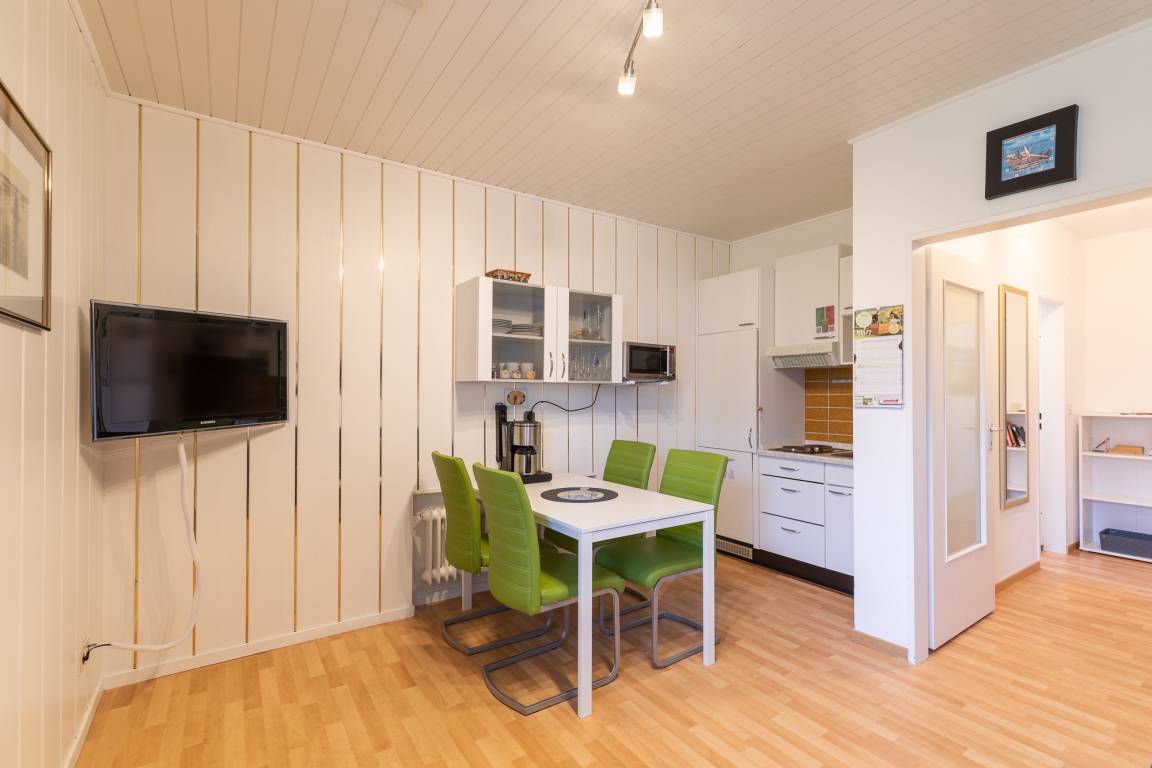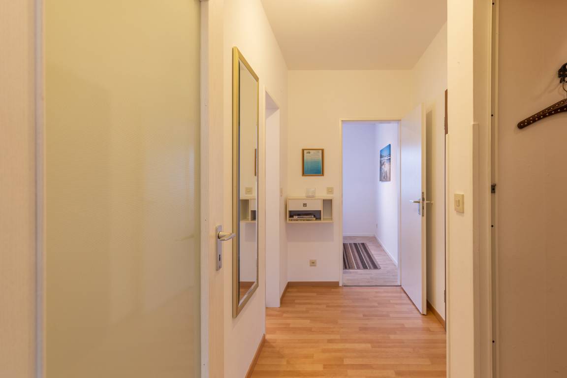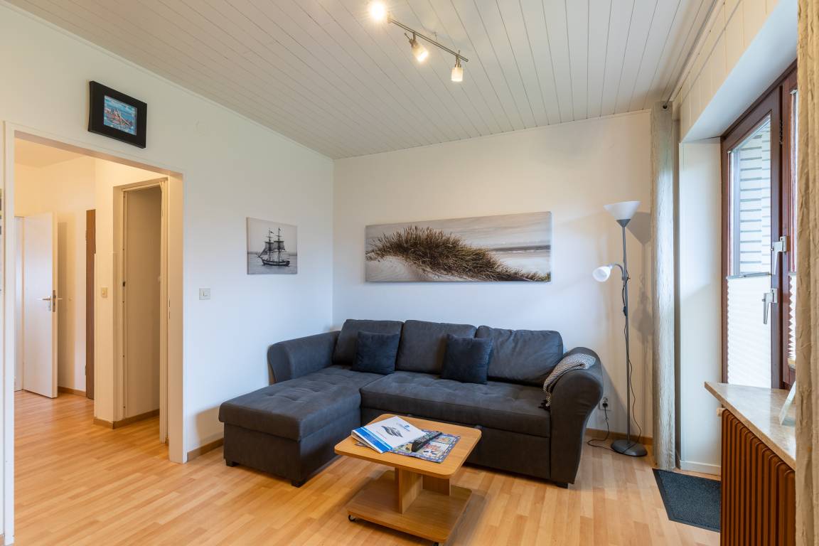 Ein Schlafzimmer mit Doppelbett (180 *200) und seitlichen Kleiderschränken. Ein geräumiges Wohnzimmer mit Küchenzeile (Kaffee- und Pad-Maschine, Heißwasser- und Eierkocher, Heißluft/Grill-Mikrowelle, Kühlschrank mit Gefrierfach, Geschirrspülmaschine, 2 Kochplatten), Essplatz, Schlaf-Sofa, Sat TV. Langer Balkon mit Sitzmöbel. Bad mit niedriger Duschwanne + Föhn. Begehbarer Kleiderschrank im Flur, Wäscheständer, Staubsauger. Gegensprechanlage/Türöffner. Nichtraucherhaus, keine Haustiere, kostenloser PKW-Stellplatz direkt am Haus, Fahrradunterstand hinterm Haus.