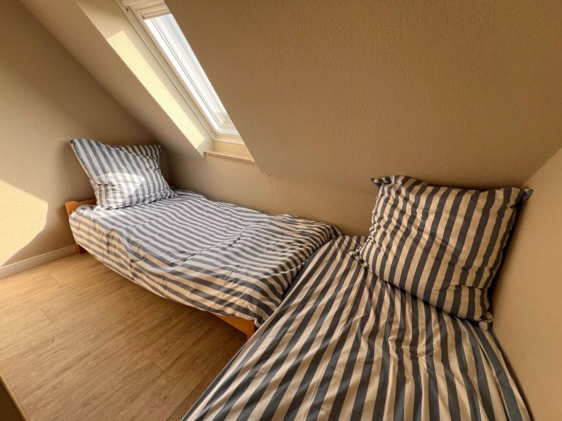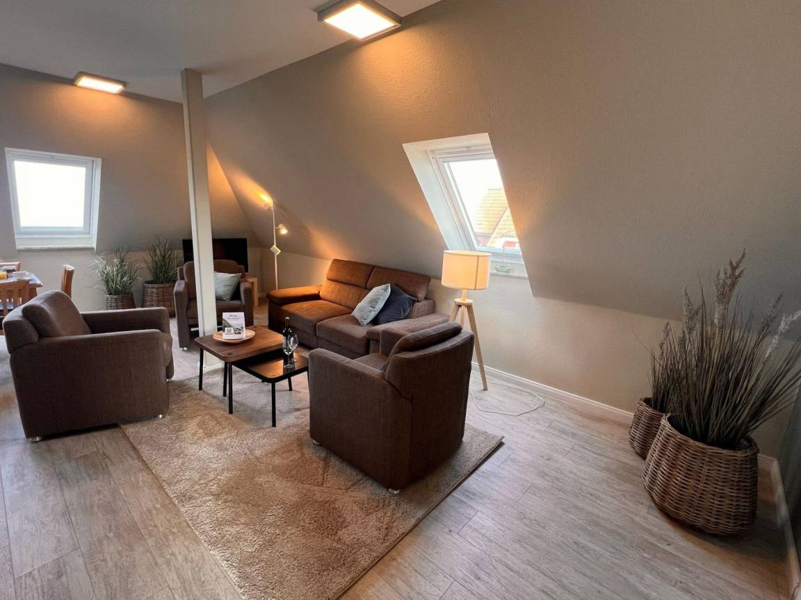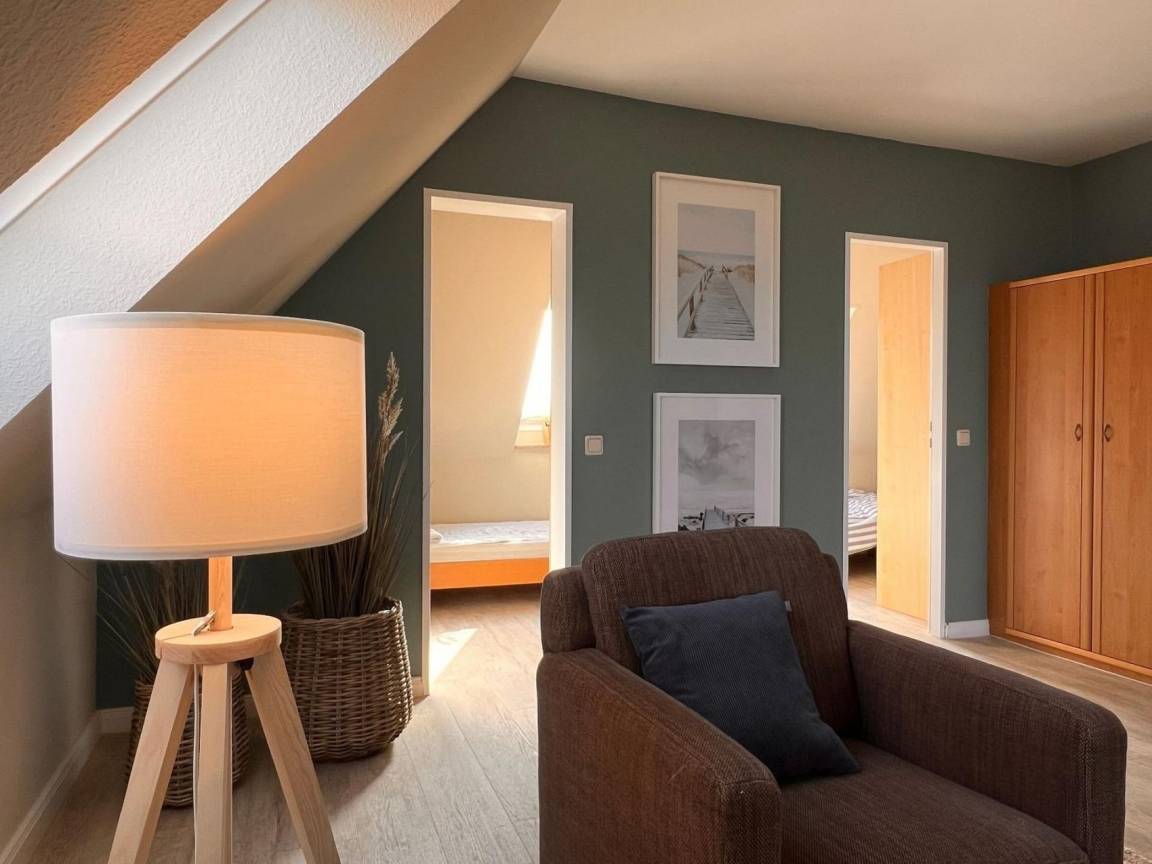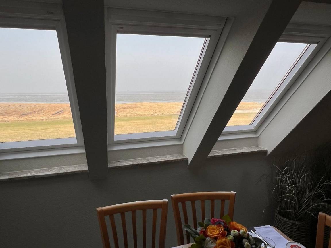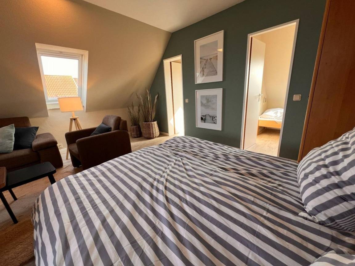 Die Wohnung verfügt über zwei separate Kinderzimmer, jeweils mit zwei Betten, sowie ein 2 m breites Ausklappbett im Wohnzimmer. Das große, lichtdurchflutete Wohnzimmer begeistert mit einem unvergleichlichen Blick auf die Nordsee und lädt zum Entspannen ein.