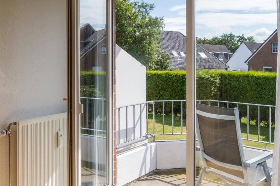 Der großzügige Wohnbereich ist freundlich und modern eingerichtet und bietet mit Sofa, Essplatz und einem schwenkbaren HDTV mit Ambilight eine angenehme Atmosphäre für entspannte Abende. Große Fenster sorgen für viel Tageslicht und führen direkt auf den Südbalkon, von dem aus Sie einen schönen Blick in den gepflegten Garten der Ferienanlage genießen können.