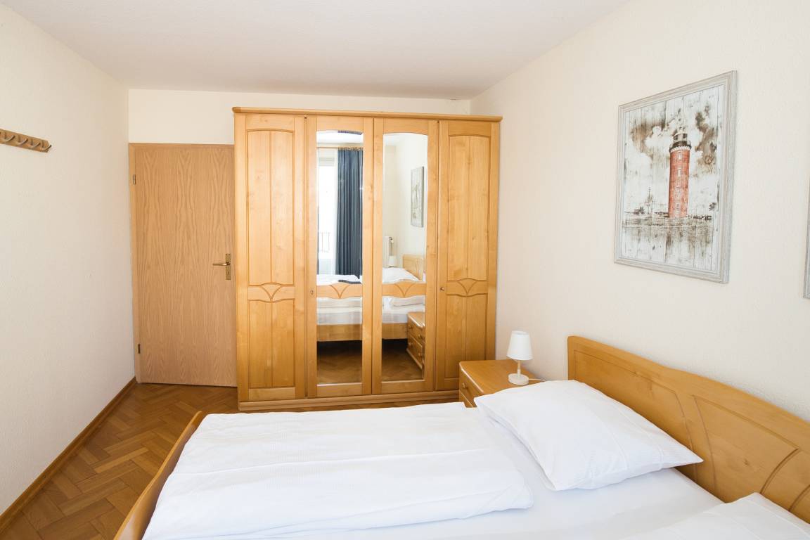 Das Schlafzimmer mit Doppelbett bietet einen ruhigen Rückzugsort und sorgt für erholsame Nächte. Die klare Gestaltung und die gepflegte Ausstattung unterstreichen den angenehmen Wohnkomfort der Wohnung.